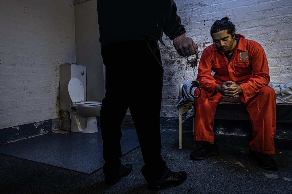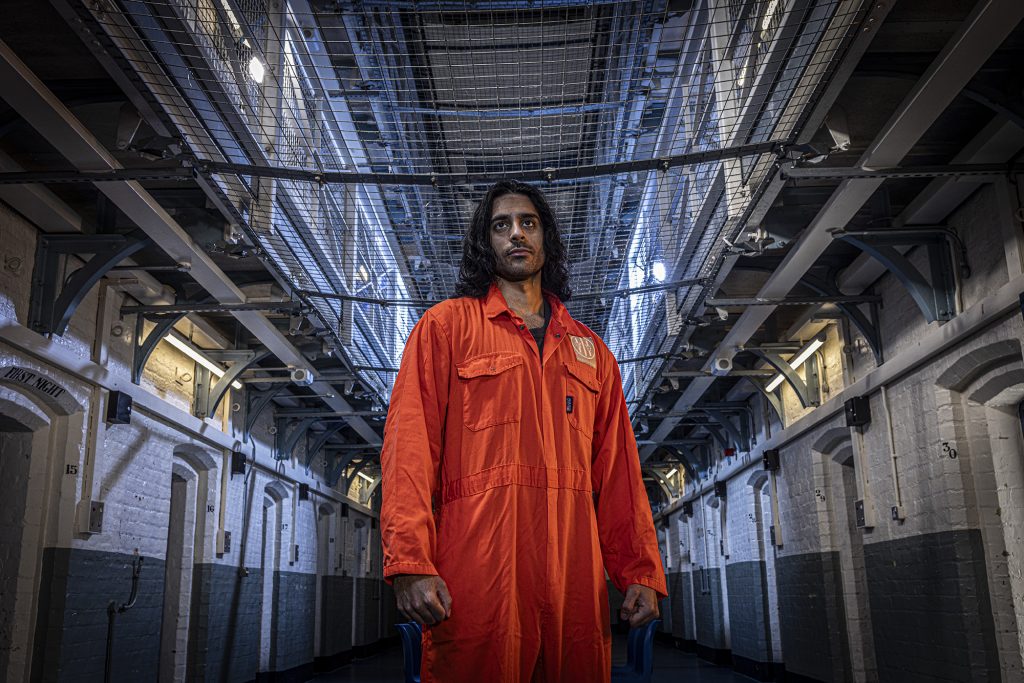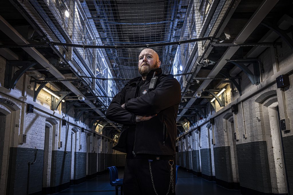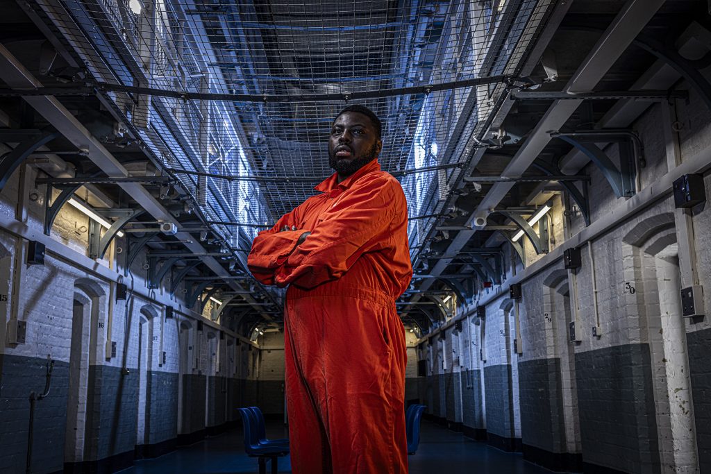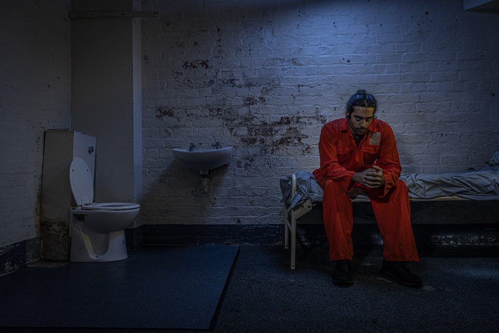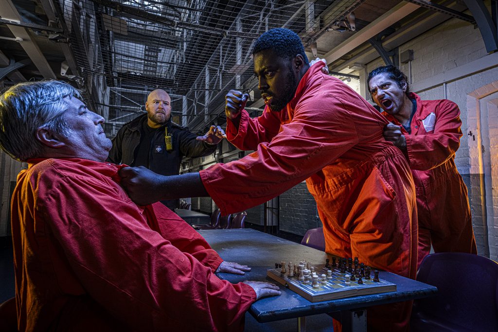 The very last image of the set features a fight breaking out over a game of chase and it was interesting to see the lighting setup for this being developed. I didn’t expect the light to be so cold on the seated character and the guy furthest on the right. The prison officer has a warmer tone on his face and this was coming from a CTO gel on a soft box to the right of the photo, that I happened to be standing behind.
