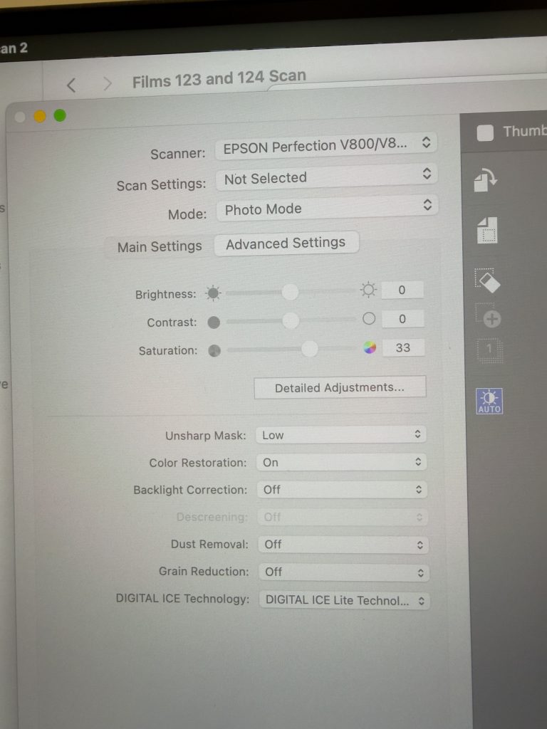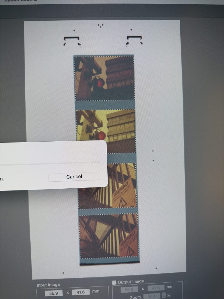 As I continued scanning the negatives on Epson Scan Euripides came over for a chat and to see what I was doing. He asked me what the scan settings were configured as on the software and I showed him that I was using the basic settings, he suggested that I used different options such as Colour Restoration, Unsharp Mask, Grain Reduction, and Digital ICE for dust and scratch removals etc… These setting scan be seen in the screenshot below. He was ok with my notes that I showed him from my online journal on the bracketing settings that I had made, and documented on this post. The first scan I made using the new settings, with the dark area of the frame being removed, it was soooo noisy and showing some cyan coloured noise all throughout the image.