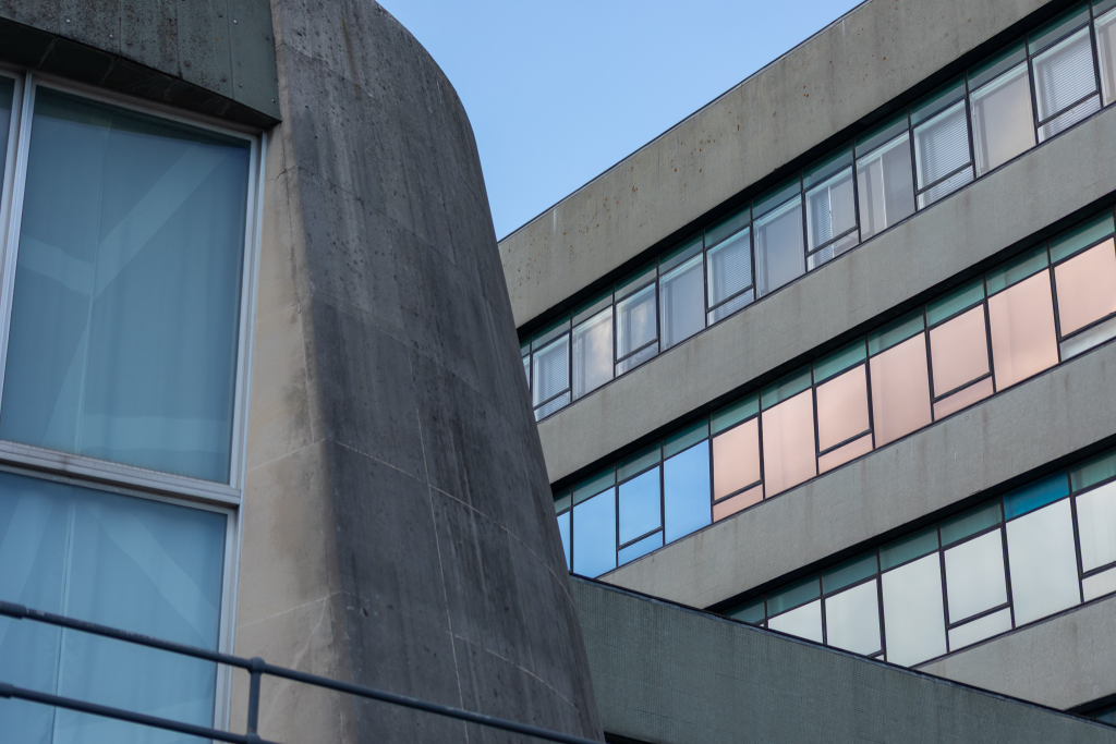 The other image on the desk is seen as a wider view from outside showing the reflective glass film on the main offices and a section of the circular council chamber dome. You can see the pattern on the net curtains inside the chamber and the lovely Portland Stone nearest the window frame, moving out to when it becomes grotty and unkempt. The lines of the offices and the fences of the chamber and walkway provide a flattened out V shape with my eye being drawn to the centre immediately and then wandering off around the image to explore what it consists of. The steel of the safety hand rail, the aluminium of the tall windows, the different clean and dirty Portland Stone, the mosaic green tiles heading out to the bottom right and then the mirrored windows and black window frames, all topped off with the blue sky make this appealing to me. It could almost be a collage of two different images.