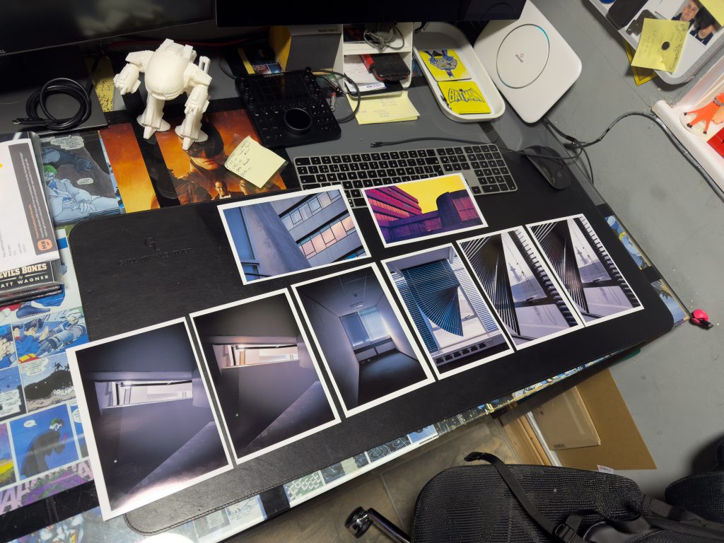 On the desk in the photo above you can see six photographs with two of them replicated with no colours. My attempts at using redscale film for the project are not wholly satisfactory and whilst the yellow toned image at the top of the selection is funky there is just too much grain and noise from the scan and colour restoration process, as was previously described in this post. It might make a good instagram post but I don’t feel it gels with the remainder of the project which consists mainly of muted tones, blues, greens, greys, blacks and whites.