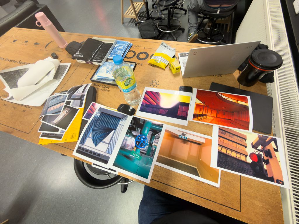 The evening before the day in Uni I decided to print out a few larger versions to try these out, as well as a couple of others that I thought might work in a larger format. You can see from the workbench in the photo below that I have the blind printed on A4 as well as the redscale weird coloured image, and then have chosen two other redscale photos, the walkway that looks really orange and then the red light and offices which have a slight red tint to them. Underneath these is a photo of the bare walls int eh emergency bunker. Next to this is a green and blue image of a valve on the water heating system that I quite like but I don’t feel it sits well with the overall look of the project. There are a few other colourful images that I have from interior shots that I think it might fit with but I feel it doesn’t inform me of the Shirehall and its decrepitudity.