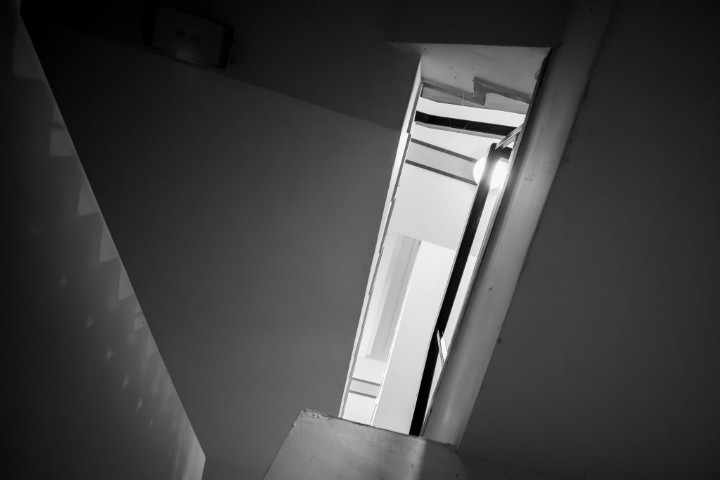 In black and white, the light is consistent temperature throughout the picture, the view upwards is a lighter tunnel than the foreground and the sawtooth form on the left wall is also hinted at on the top of the image as well as slightly on the right hand stairs below what would be the handrail. The circular light being partly obstructed also shows where some of the light is emanating from and I had to remove, using lightroom masking and removal tools, a small area on the emergency light which looked like a crap lens flare.