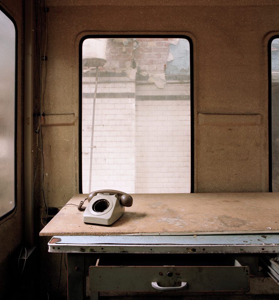 This photo works well with the one directly to its left in the topmost picture. It shows an empty office that would have once been populated by someone senior at the council, names and positions are on the door labels, but the same balance of a closed blind and open one appear in this obviously different location within seemingly the same building. The muted, tired, and grubby green carpet plays well with the blue from the blinds. The limited amount of sunshine streams through the slightly open blind and illuminates the wall to the right whilst the blind on the left appears to be hiding something outside. This is the Lord Hill’s Column but it could equally be a large industrial chimney, or other structure. The brown of the skirting and the trim around the radiators built under the windows pleases me and balances off against the false ceiling with its own grid work mirroring the gridwork carpet tiles on the floor.