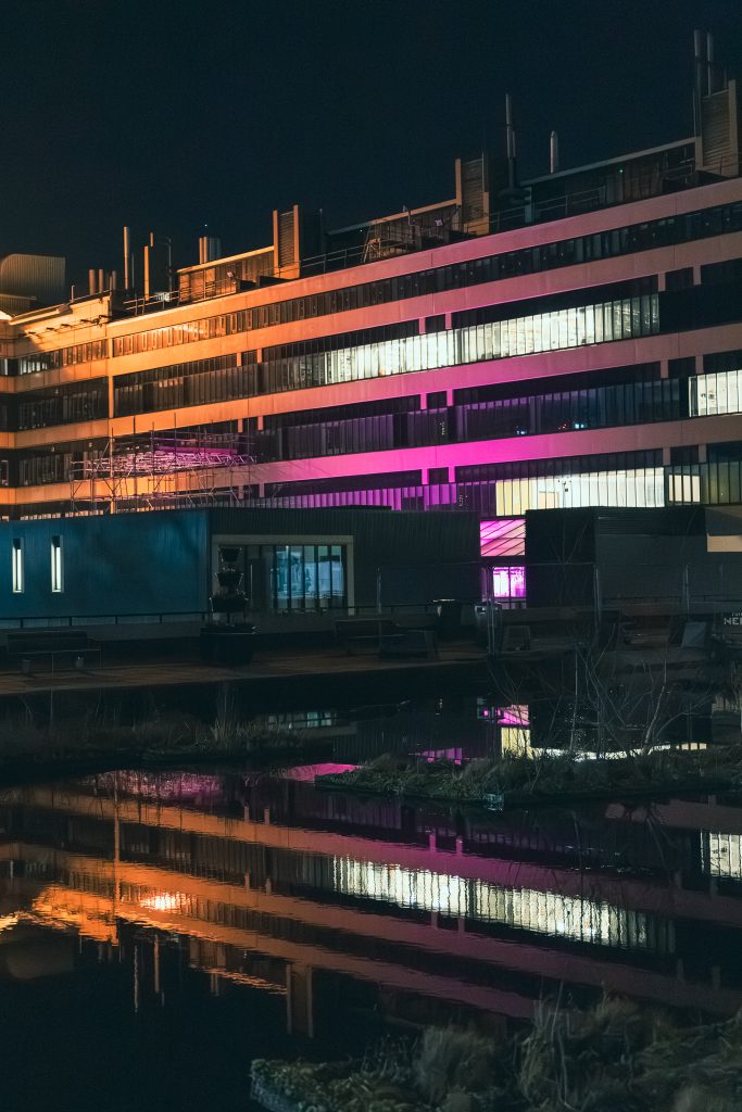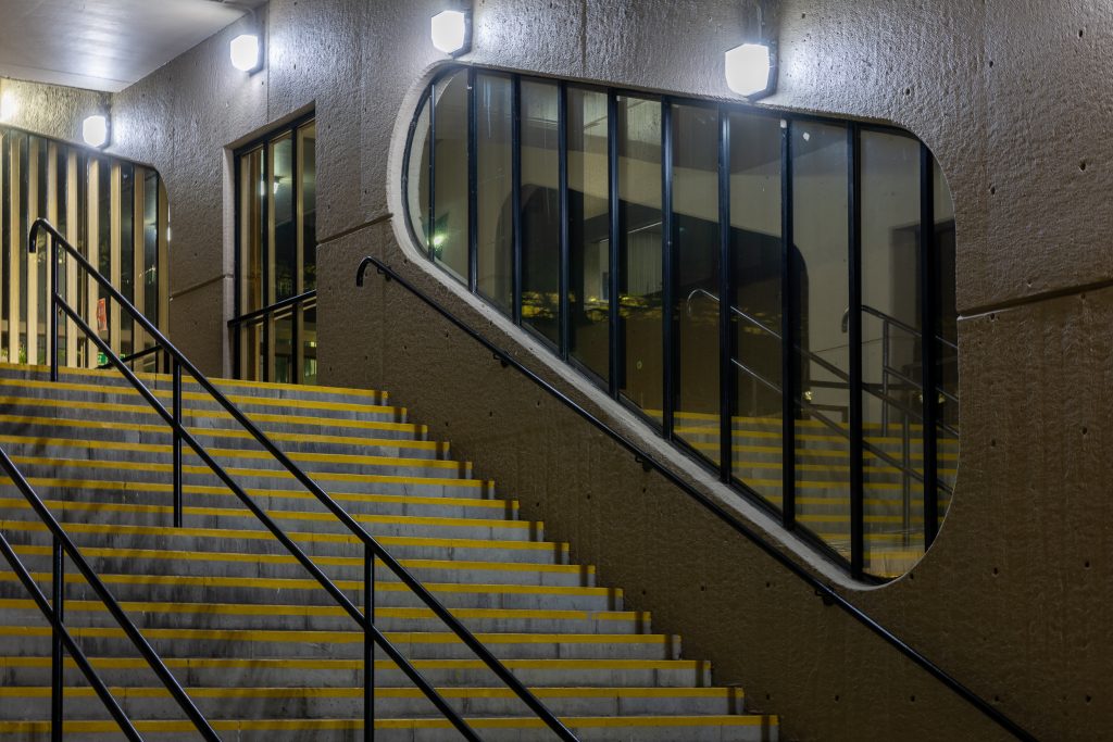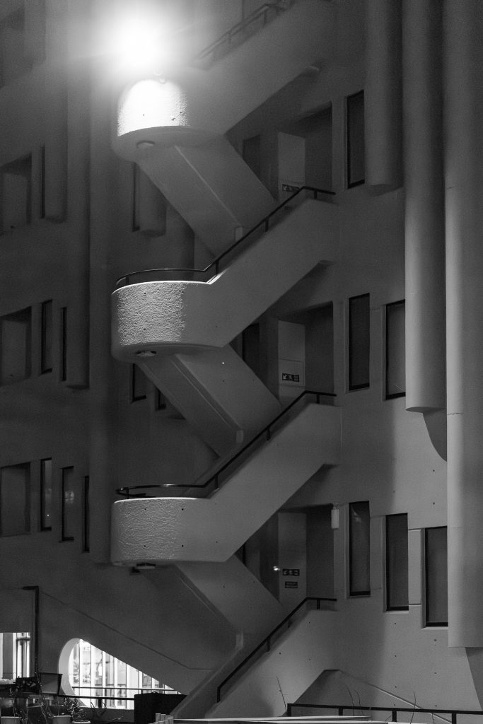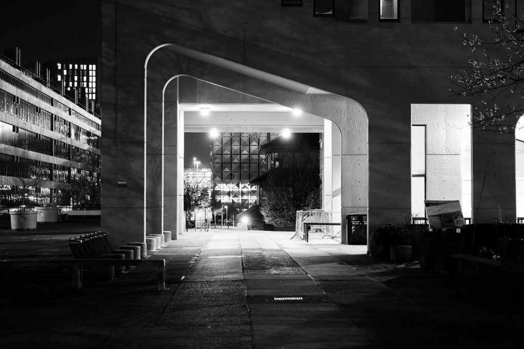 I was on the way to the campus and took a wrong turn but ended up underneath the Irene Manton building which leads up to “Big Rodge” I was happy that there were many lights on around the campus but there were few lights on inside any of the buildings. The Red Route was also shut and locked up with no access so I was limited to the exteriors, it was also 20:30 at night in the dark so I’m not surprised it’s all secured.
