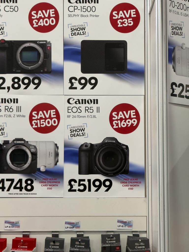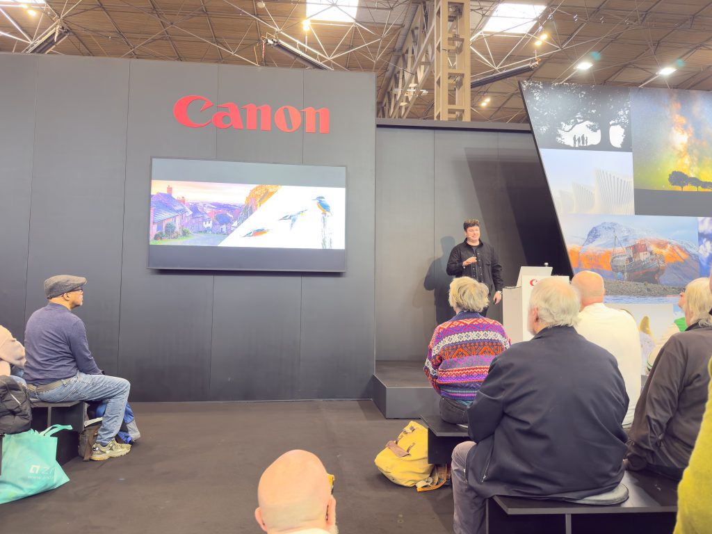 With the deal made I offered up my card and with that my work annual bonus went across to the LCE bank account. The boxes went in my bag for a look through later when I arrived at my next destination. I wandered over to the food trailers in the one end of the hall, had something to eat and drink and then went into the Canon theatre to watch a presentation by Jack Lodge showing some nature and landscape photography using the Canon R5 mk ii and the R6 mk iii. He went through the benefits of each camera, even suggesting that the R6iii with the lower resolution sensor was better for astro-photography and low light situations. His work was outstanding and he also talked about the excellent benefit of the pre-capture function whereby you can have the camera await your shutter press and then it saves the last half a second’s worth of photos onto the card too. He explained it by showing a photo of a bird taking flight from a tree branch, and that if he’d not had precapture, his first shot would have been a photo of the bird nearly out of the frame. With this function though he can wait for the bird to move and then look back through the shots at the different times and choose the shot he wants to keep. Impressive stuff.