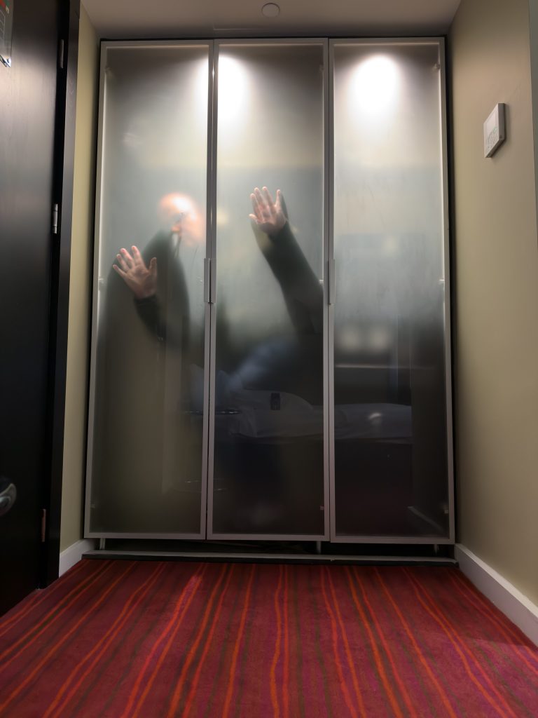 Watching the news on the TV back in the room I noticed that the wardrobe doors were frosted glass so I did what every 52 year old professional man does, take a self portrait using a timer on my phone whilst hiding behind the glass to portray a spooky scene.. Obviously.