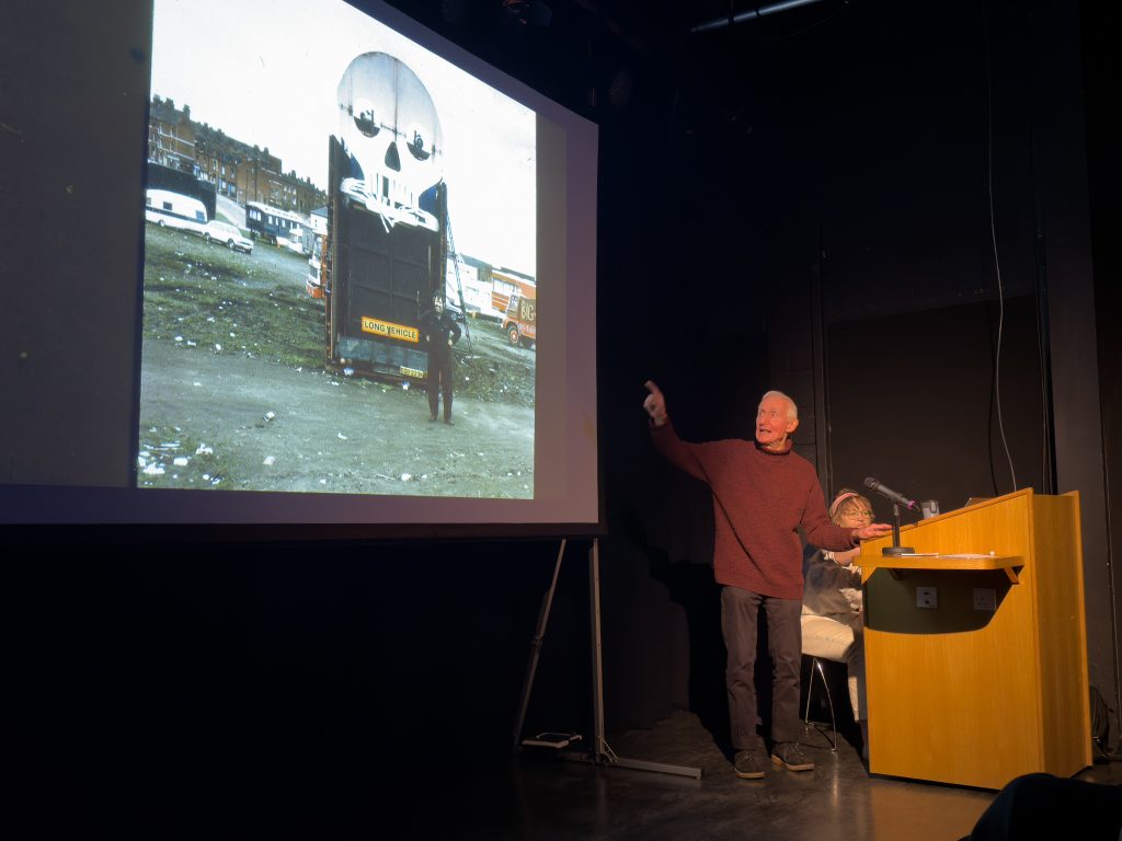 Not Matt Finn’s film though, he and Jamie McDonald had had to cancel due to some copyright issues so it was into the other room, “The Studio” to hear a talk from Peter Mitchell. He is a photographer who I became aware of after seeing his exhibition in the Photographers Gallery in March last year. His work on the destruction of the Quarry Hill Flats in Leeds is amazing and looking back through my journal I now see that Matt Finn recommended I look at Mitchell’s work in 2021. It’s a full circle. Peter stood at the front of the room and talked about his photography, his locations and even strange found objects that he’d picked up along the way. He seemed to be a bit confused and was largely guided by his assistant, who is from the publisher RRB who publish some of his work in books. He was quite a funny presenter but often was unable to get out his words and I felt a bit uncomfortable that he was struggling a little.