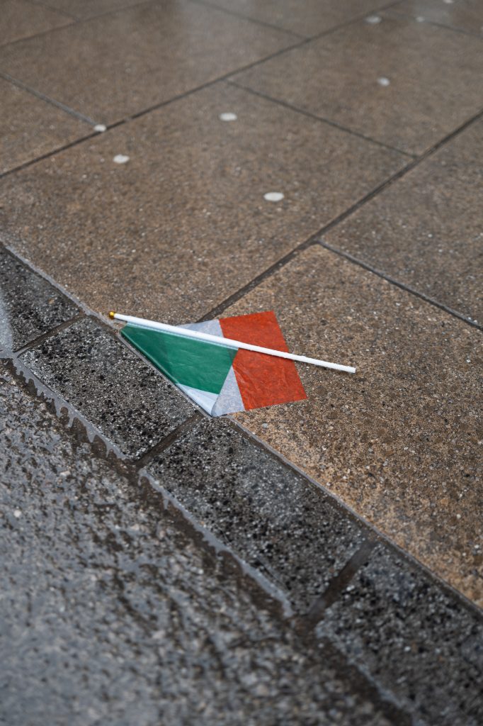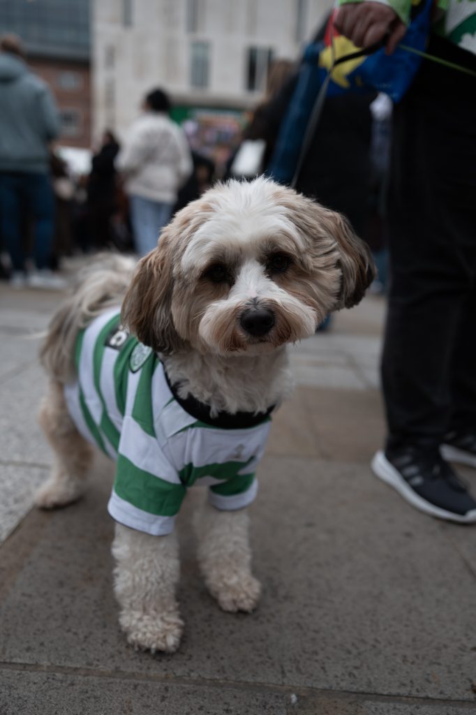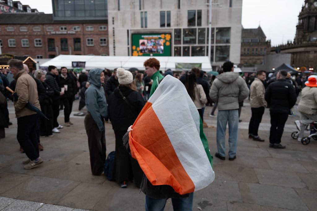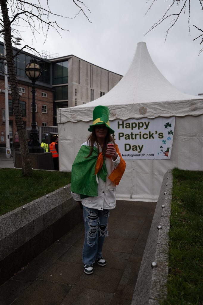 Once I’d looked at the exhibitions and seen the wide variety of works featured there, I took leave and headed off to the square outside, where a stage was set up and there was currently some Irish dancing going on with many of the crowd wearing green, funny hats, costumes and even dogs with green clothes on. It was teeming down with rain and completely soaking everyone who was there to celebrate. It didn’t stop everyone and they made the best of the situation.