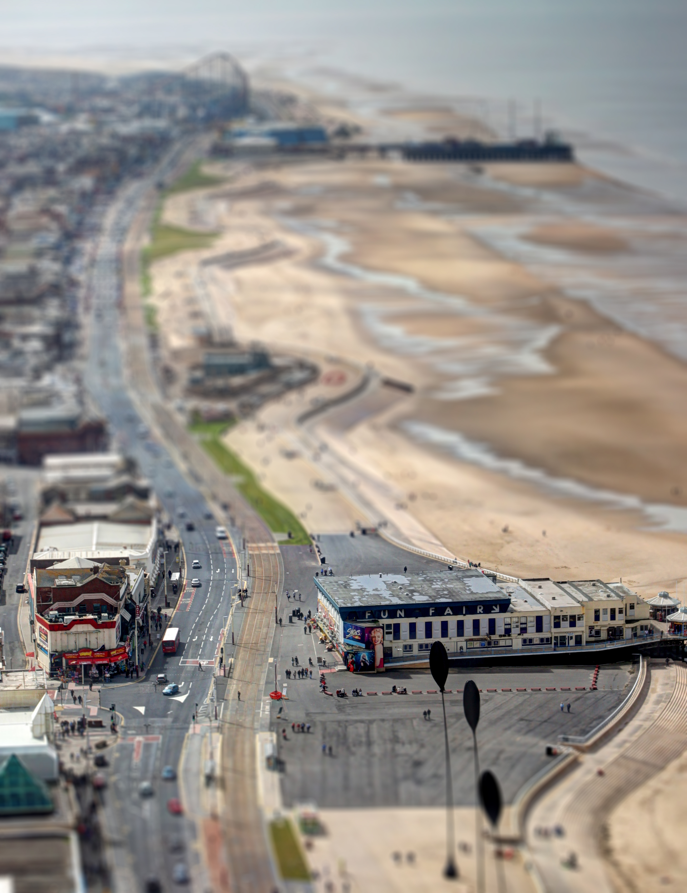 From the very top of Blackpool Tower you could take no decent photos at all, they’ve got some ridiculous netting all around it to stop small children making a mess on the top of the tower Ballroom when they’ve dived to their deaths. From the next level down however you could get a decent photo of the promenade and all the way up the beach to the South Pier. This is when I planned the Tilt-Shift effect picture.