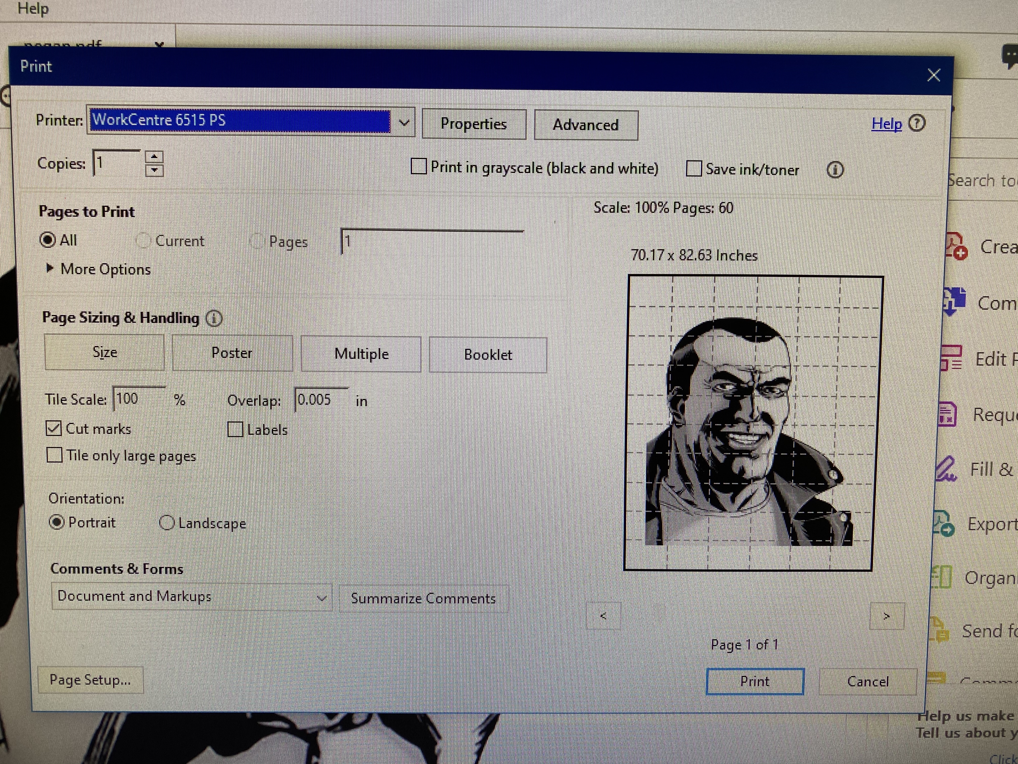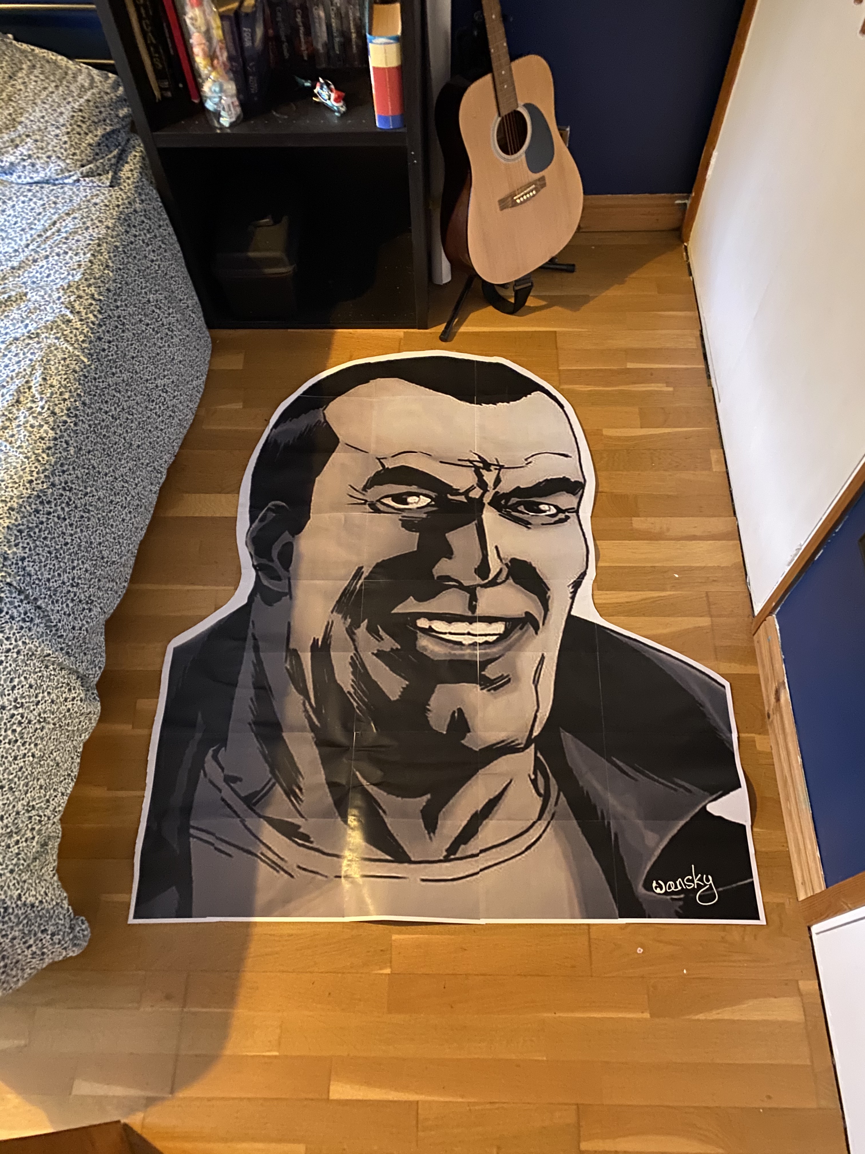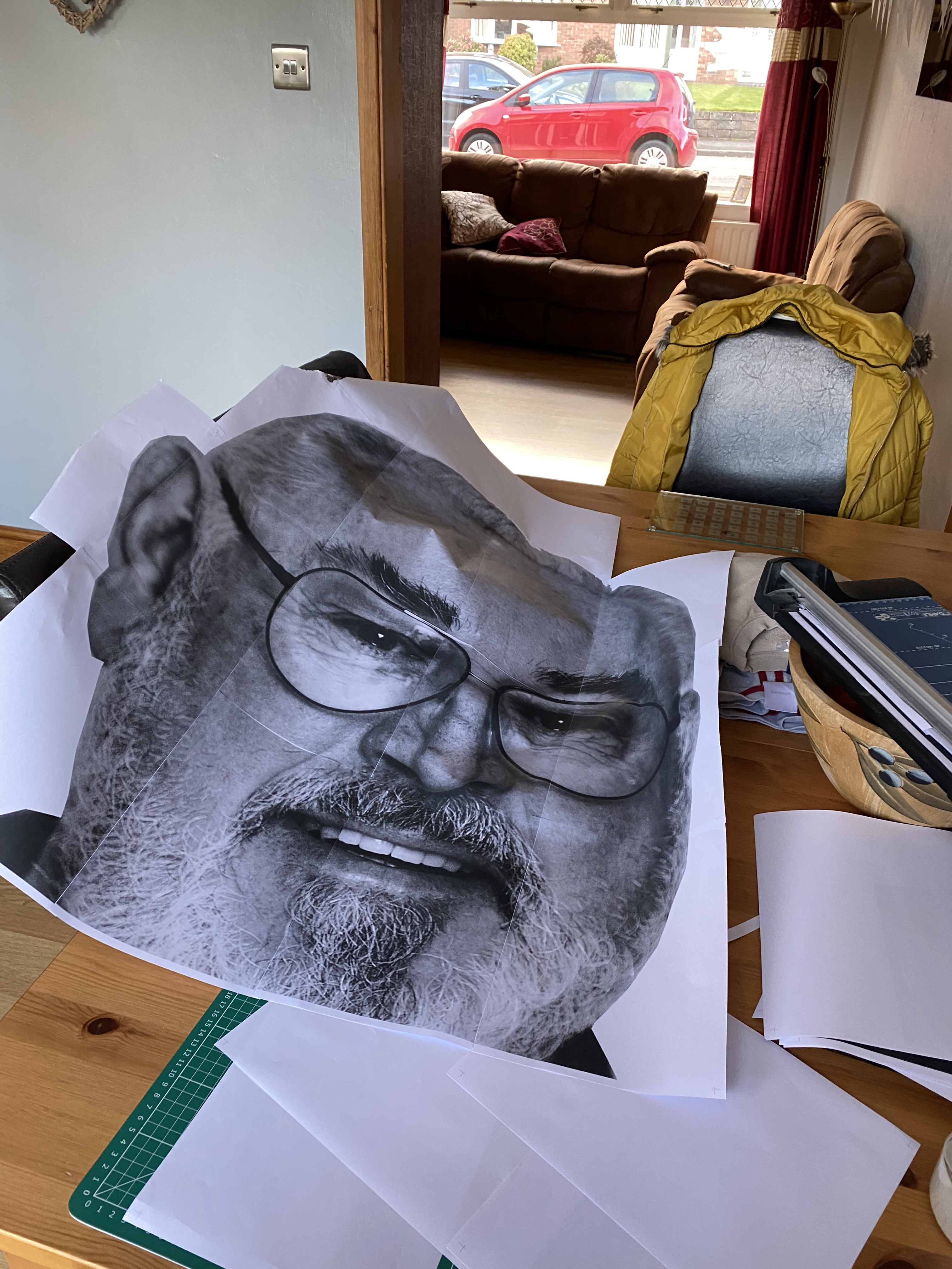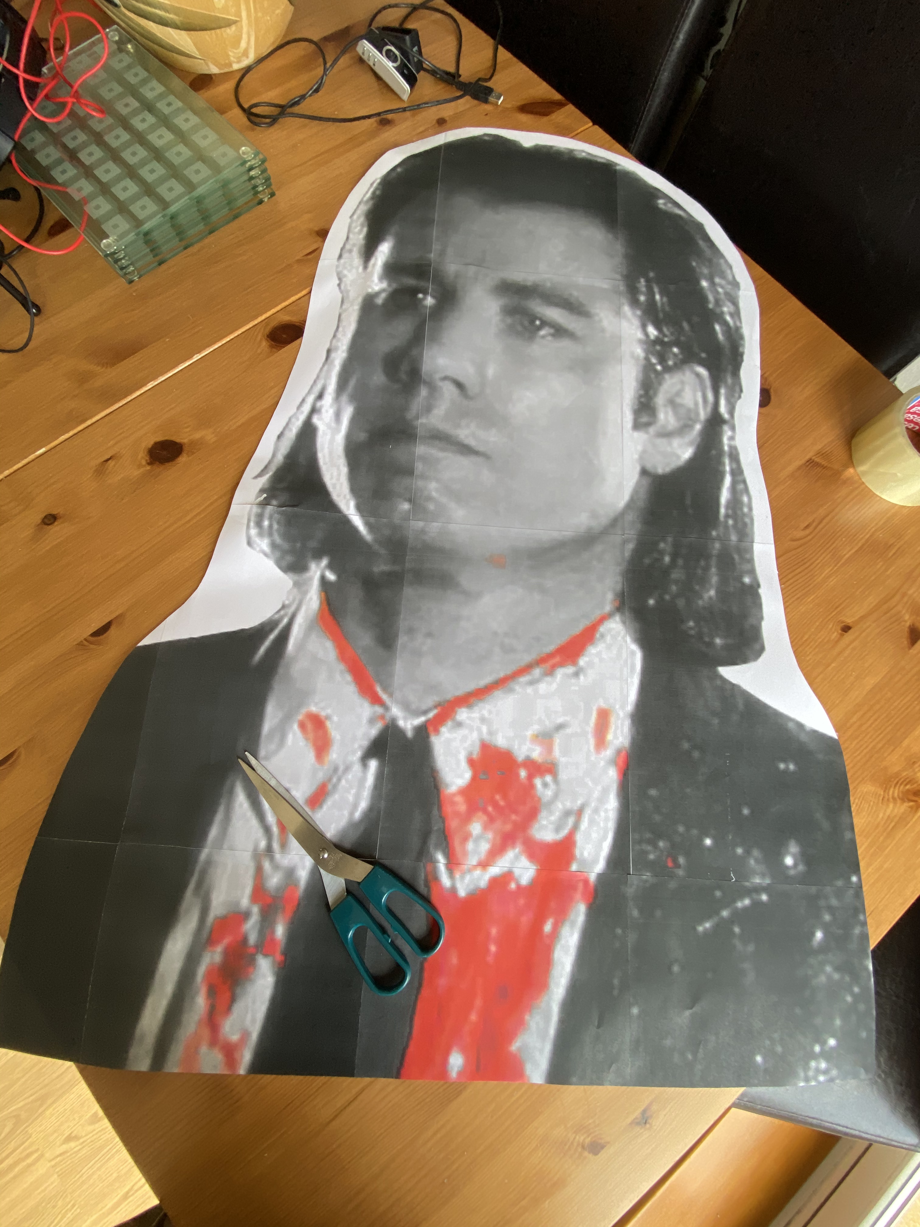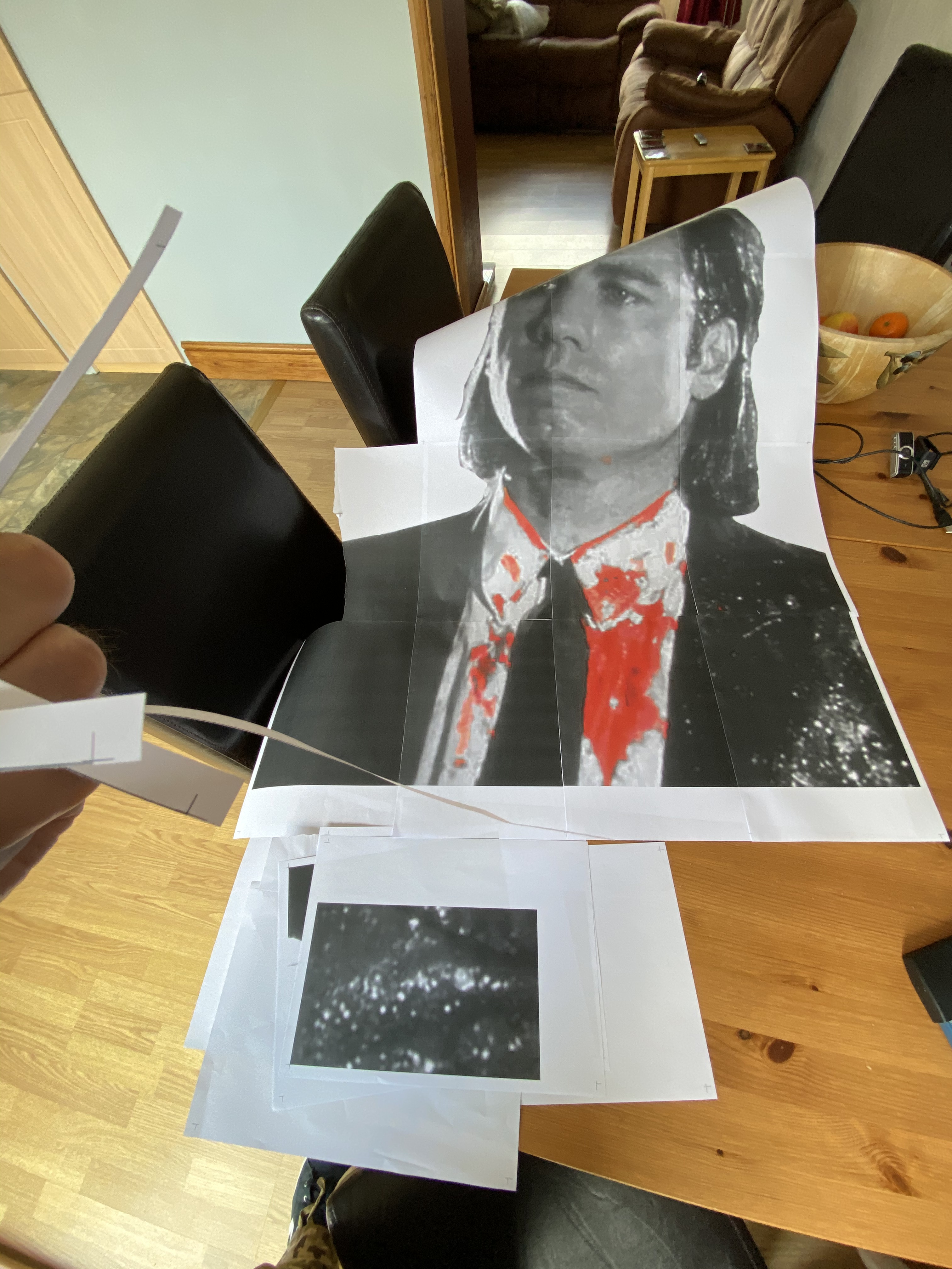 Phase two of the brain wave hit me then, I could include an illustration and spray through a template in a Banksy-esque fashion to display the character’s visage! I went to work finding an image of Negan from google images as drawn by Charlie Adlard, blowing it up to a larger scale and then printing it and trimming out the parts for the template. I found the perfect image and changed the size to something larger, saved it as a PDF and then printed it out in Poster format, where it will spread it out over multiple pages and give you alignment marks etc..