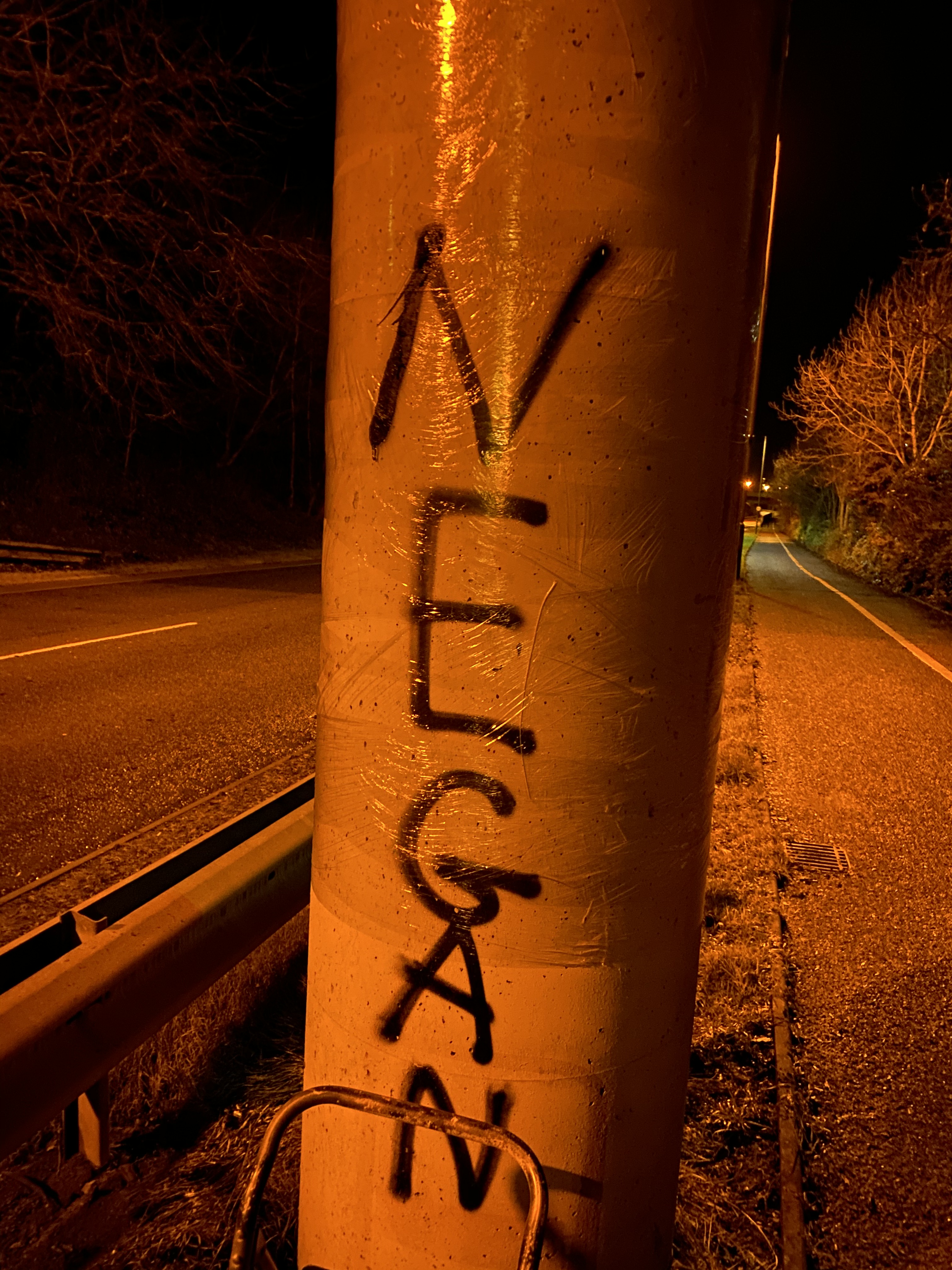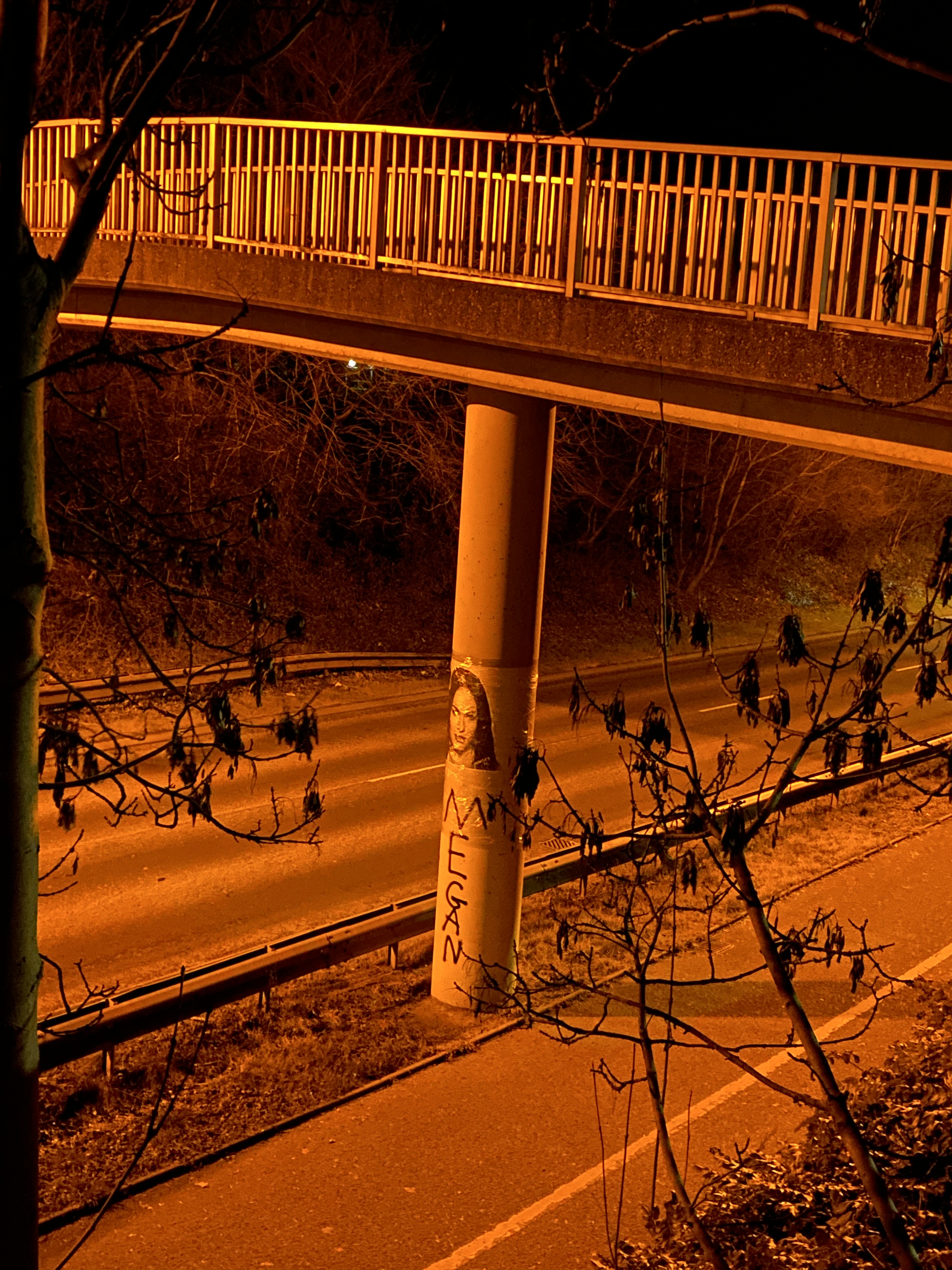 My son and I had agreed that the Saturday night after midnight would be an ideal time to go and fix Negan to the bridge. It was quiet, lockdown was in effect and there was little traffic around so we parked on Bell Lane and walked the last few hundred feet with the toolkit.