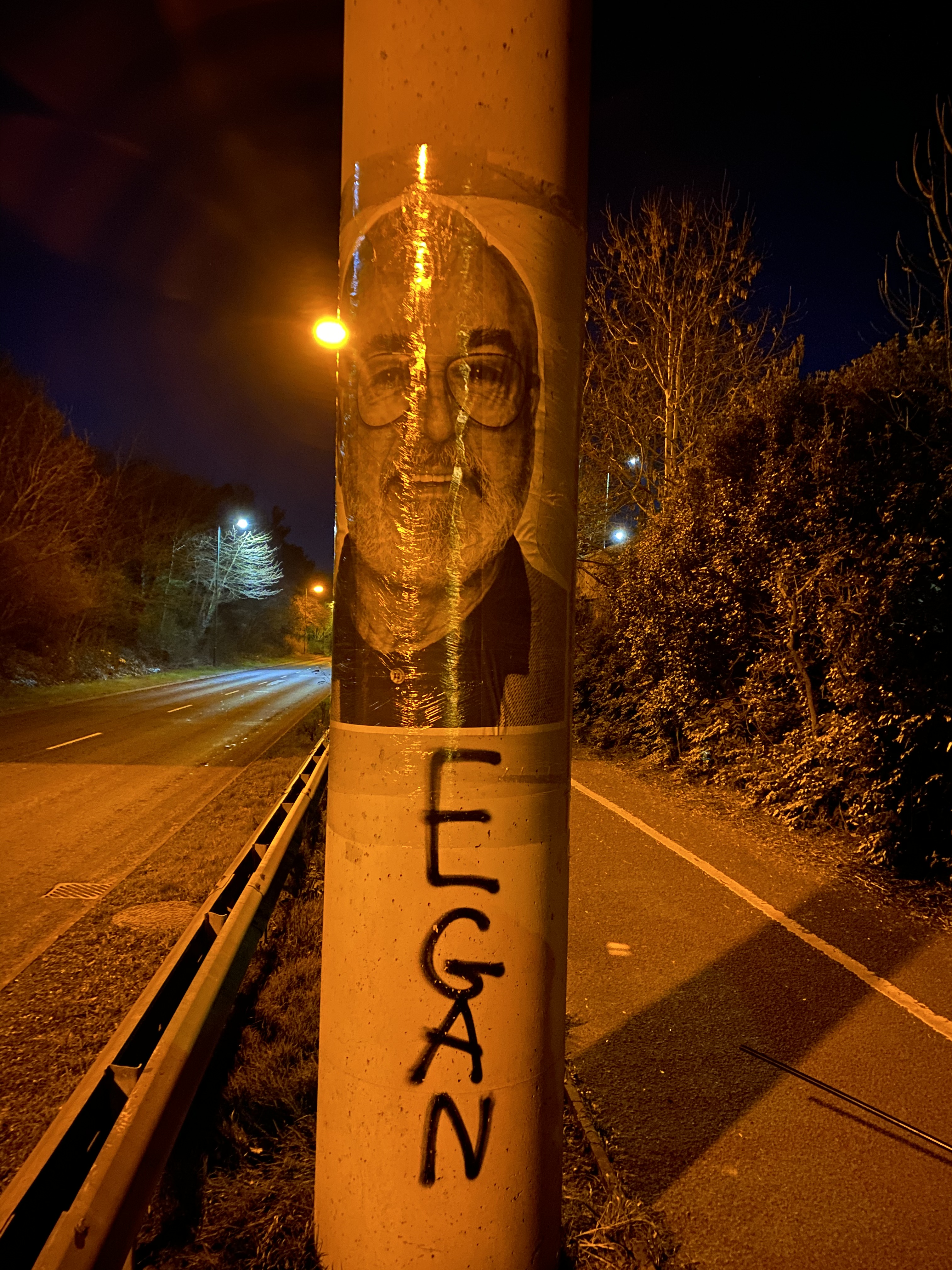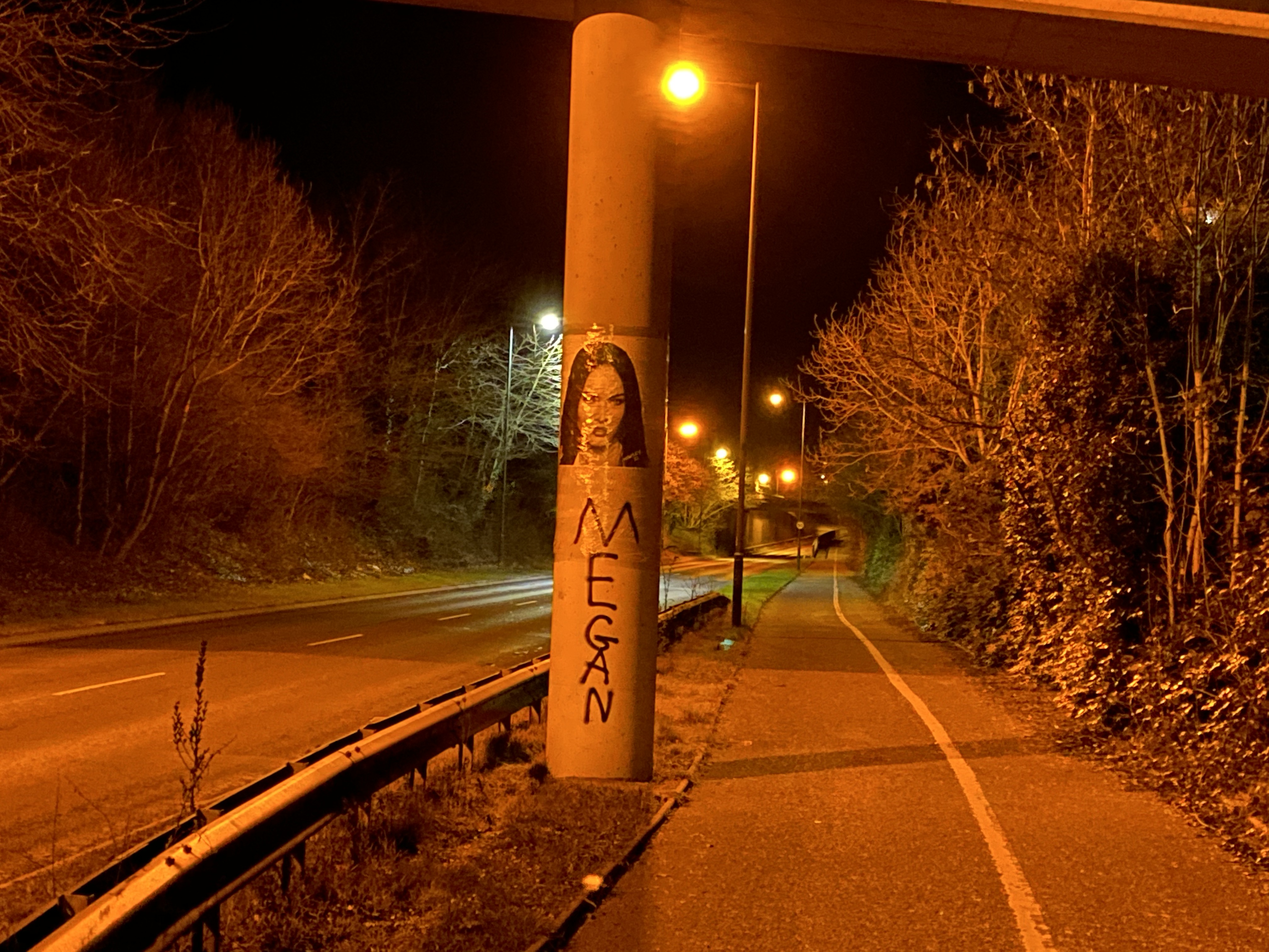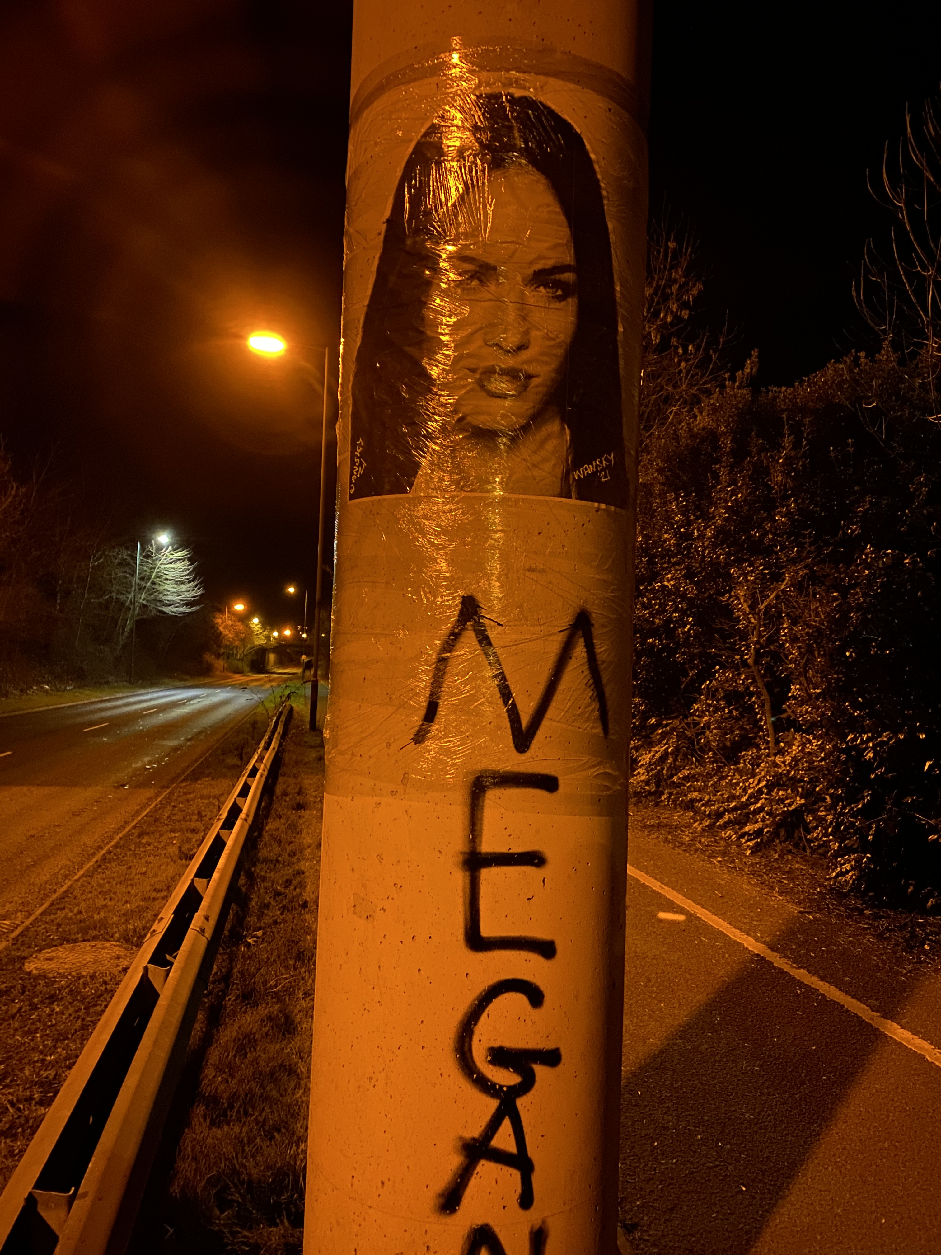 Two guys walking a dog whilst smoking a spliff passed by at one point. (The men were toking, not the dog, just to be clear) They asked if we were the same people who’d put up the Megan Fox picture and then promised not to let on that they’d seen us before they carried on to a 24hr shop no doubt for some Coco Pops and Twixes.
