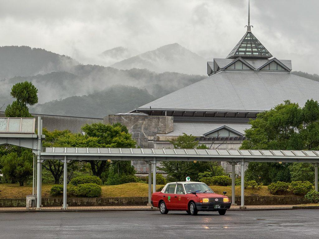 Still at the Kyoto ICC in the rain and I was undercover making pictures of a concrete gutter and drain, when I turned around to see this taxi about to leave the car park. The driver had opened the rear door for the passenger and then began to turn to leave the area. The taxis in Japan are another fascination for my photography. The colours, symbols, signs and even the neatness of the drivers all tell the story of an area, this one had yellow headlights which looked a little european and this image shows a three quarter view of the vehicle. A side or front aspect would have meant the loss of the details, so I waited for it to turn towards me before pressing the shutter release.