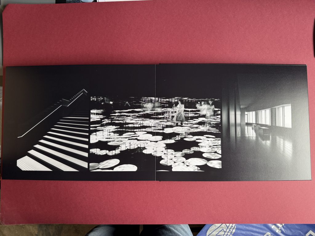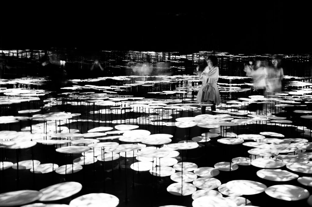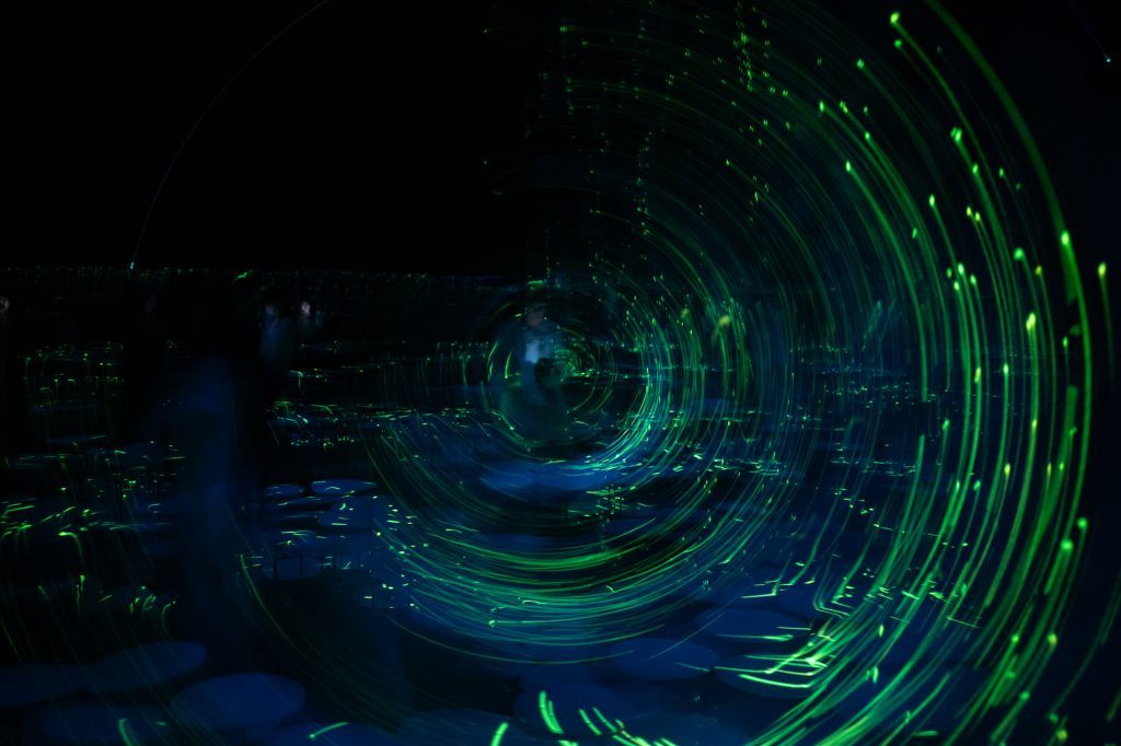 In a room on the walk around the immersive experience was a very sloped floor from high up to a lower doorway with a path of sorts through these glow in the dark or fluorescent discs on sticks, seemingly placed at random. Walking through them provided movement to them as they swayed back and forth after a hit from a leg or a small child’s head. The blacklight in the room along with projections made them appear as if they were lily pads floating atop a pool that we were waist deep in. On top of the projections that also made it look like thousands of fireflies were surrounding us was a soundtrack playing from all directions, music and organic sounds all designed to disorientate the visitor.