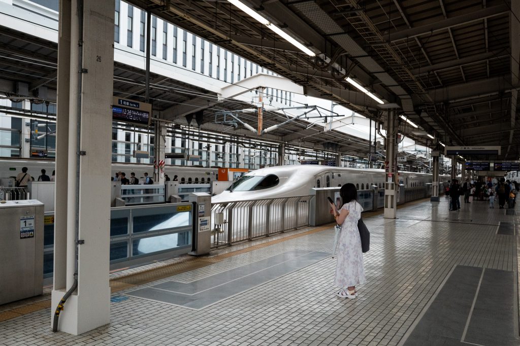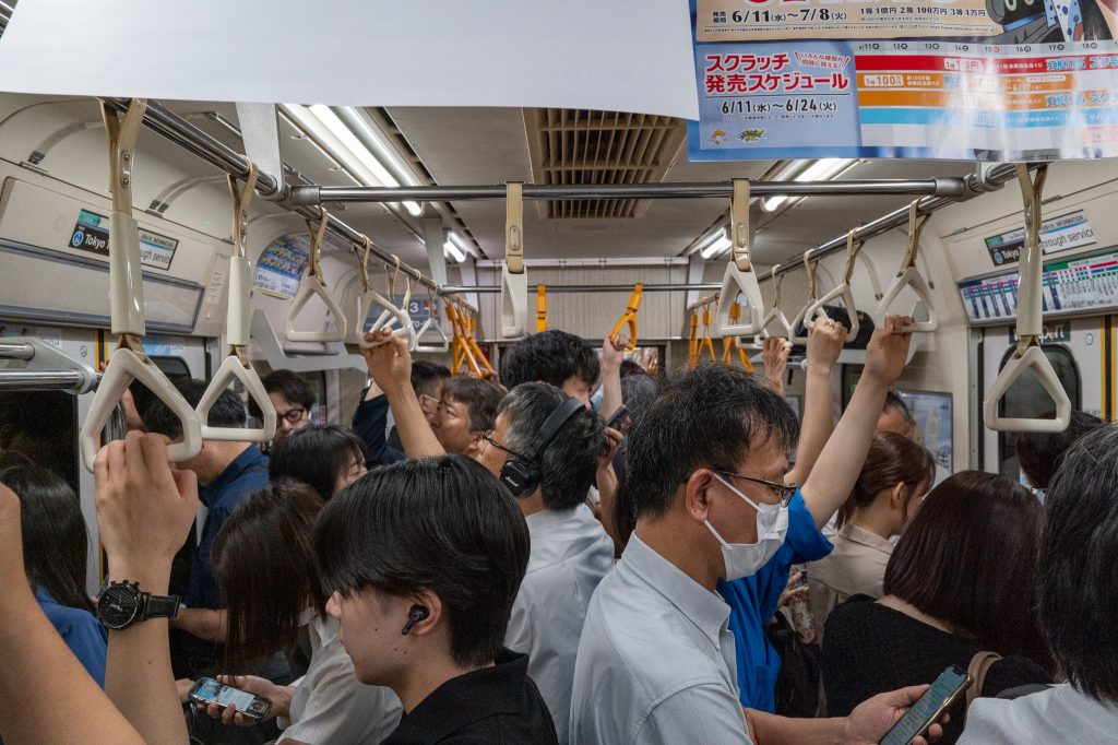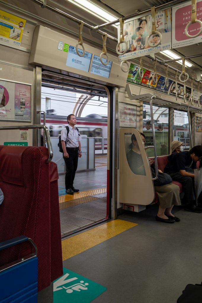 Unlike the London Underground where people barge at the doors in no sense of order, the Japanese have queue lines on the floor of the platform that encourages travellers to stand in an orderly fashion, ready to take your turn at entering the train. The image conveys the order and the compliance of the rail users. They sit in their chairs on the train making zero noise, careful not to accidentally offend any other person. The plush seats are similar to those on London’s tube network but are generally clean and tidy with zero litter to be found. The number of hoops hanging from above hints at just how packed this carriage could be if it were the rush hour.
