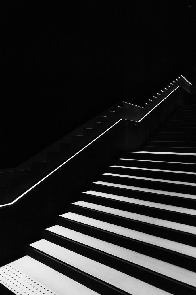 As you can see in this image the stairs are illuminated and as I got to the bottom, I turned to see the geometry in them The handrail illumination hidden in the sunken part of the wall and the rest of the light was a blue colour but I think it works better as a black and white low key image. The steps and the lines of the handrail lead you into the image and the top left corner consists of a large black negative space which I feel balances out the busy right hand side. The steps appear to disappear to a mysterious place much as the Stairway to Heaven in Powell and Pressburger’s film A Matter Of Life And Death, or even Disney’s movie Soul. The top of the stairs is out of view, and the viewer, unless they’ve been there, is oblivious to the fact that the top is a simple doorway to the entrance hallway.