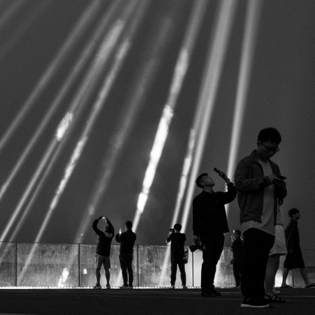 This image was shot at 1/60th sec, with an ISO of 2500 and an aperture of f/1.7. The light rays are blurred mostly because they were waving around but it also allowed me to catch the misty nature of the air on the top of this skyscraper.