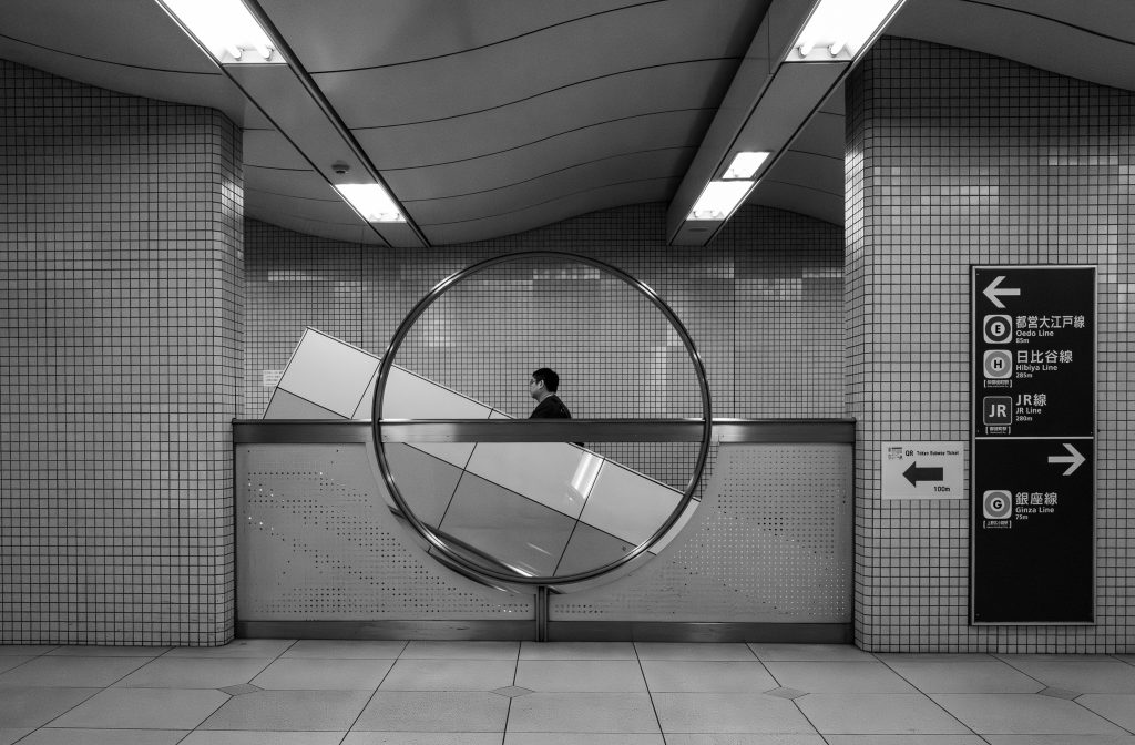 I was on my way to Ueno Park to capture some images of the concrete buildings that make up the museums and other amenities in the area when I saw two of these circular opportunities. The first was made up of two rings, one further away but looking concentric with the nearest but that had lockers behind and felt a little more cluttered. I found this one on the way out of the station and stood hopefully with my two cameras. I have about five frames on HP5 and about four on the digital. This particular image was shot 1/500th sec at f/8.0 and ISO 25000. There is a little noise in the image but the graininess of it suits the black and white conversion. The colours in the image pull the eye away from the central figure if left, the left pointing arrow is red on a bright yellow background so very distracting.