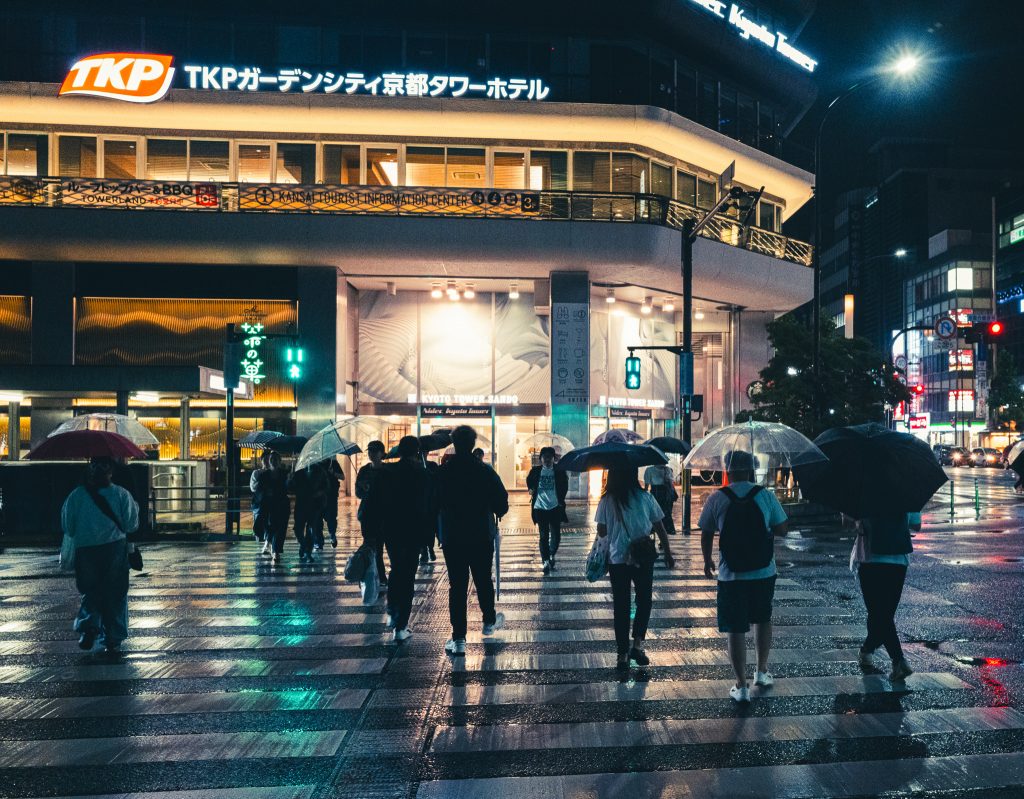 In the previous text about the rainy crossing and Shinkansen, I mentioned again my love of informing the location by including the text on signs, this one is no different. I stood near the opening of a subway into the Kyoto subway system and st my focus point on people walking past the sign in a window for Big Echo Karaoke. It was pouring with rain still and people were using umbrellas whilst going about their night-time business.
