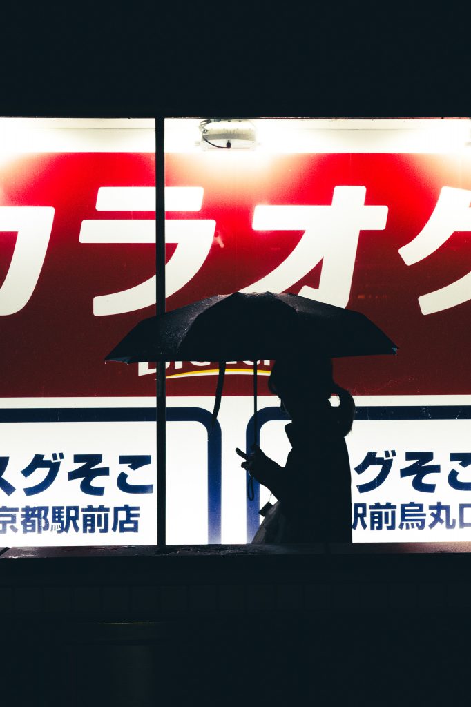 The shot above was with the settings the same as the crossing image. 1/60th sec, f/8.0 and ISO 12500. My aim was to get silhouetted figures in front of the Kanji and Hiragana characters on the signs telling passers by that this is the Kyoto Station Store. Karaoke is huge in Japan and the number of large buildings in the cities devoted to this past-time is staggering. I kept this image in colour as I liked the red, white and blue that was in the solour space of the photo. To desaturate it meant that it all looked like one layer. In this photo with the colour though you can see the wall, then the pedestrian and beyond that the shop window. It’s another photograph that is unmistakably Japan.