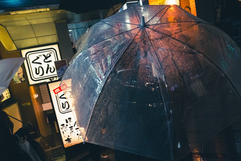This screams ” a wet evening in Japan” to me and the image is made, in my opinion , by the orange light coming through the umbrella from the doorway in the background. There are some signs illuminated too for a restaurant and although we see no complete people, the vague silhouette is visible through the plastic dome. At 1/500th sec, f/8.0 and ISO 50000 this is a struggle of a shot. I had increased the speed of the shutter as people were moving around at this doorway and I wanted to freeze the image. I also have to contend with the super high ISO which is unusually ok for this camera. As a standalone image it is a great reminder of this walk around the city at night. Joined with other rainy day images it brings home the picture of a wet few days in a city that looks better in the soaking conditions.