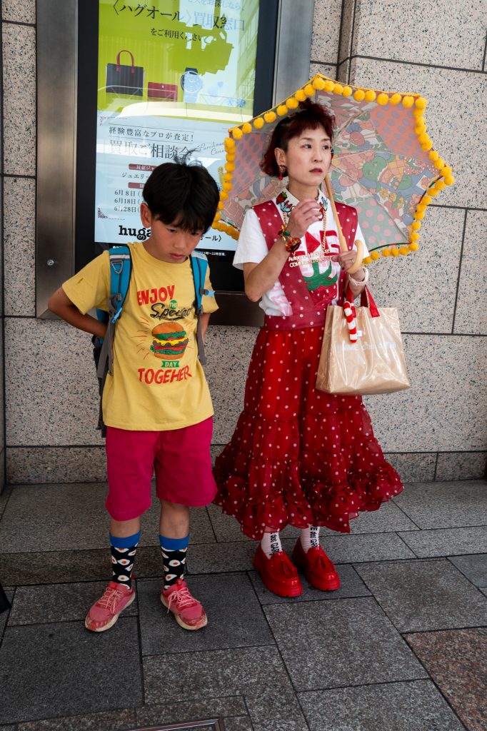 This iumage beneath is a good example of a street photo that only happens when you have the camera set up and in your hand ready to go. As I strolled down the street in Osaka on the way to Nishiki Market I spotted this lady first, dressed in a noticeable outfit. The reds and yellows were what stood out and only when I looked at the image at home I could see that her necklace, socks, shirt and even shopping bag were “Commes Des Garcons” , a Japanese fashion label. The young boy with her is in similar colours and typical of the type of English T-shirts a word in the slogan (together) is spelt incorrectly.