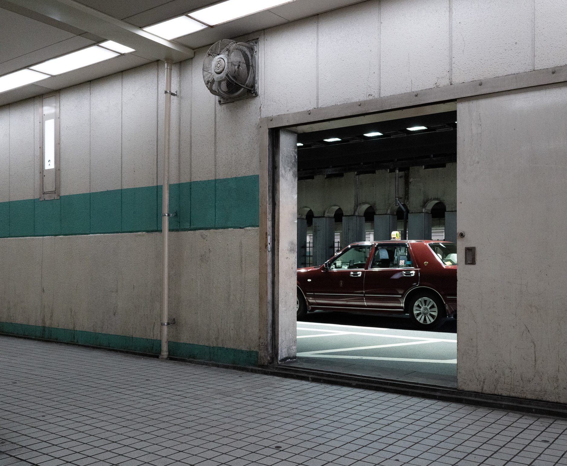 My favourite shot from the whole two weeks shooting is this image of a maroon taxi viewed in a tunnel under a building through a sliding door. As I clicked the shutter at 1/250th sec on ISO 8000 and f/8.0 with the Leica Q3 fixed Summilux 28mm f/1.7 lens, I knew that I had caught a special (in my opinion) photograph. Photos with a frame inside the frame are a lovely thing when they happen and the doorway provides just this effect. The lines in the shot all follow a path to a vanishing point far outside the left side of the frame and the grid on the floor, along with the light blue/green lines and even the line of lights in the roof all serve to show you the direction the car will be moving in.