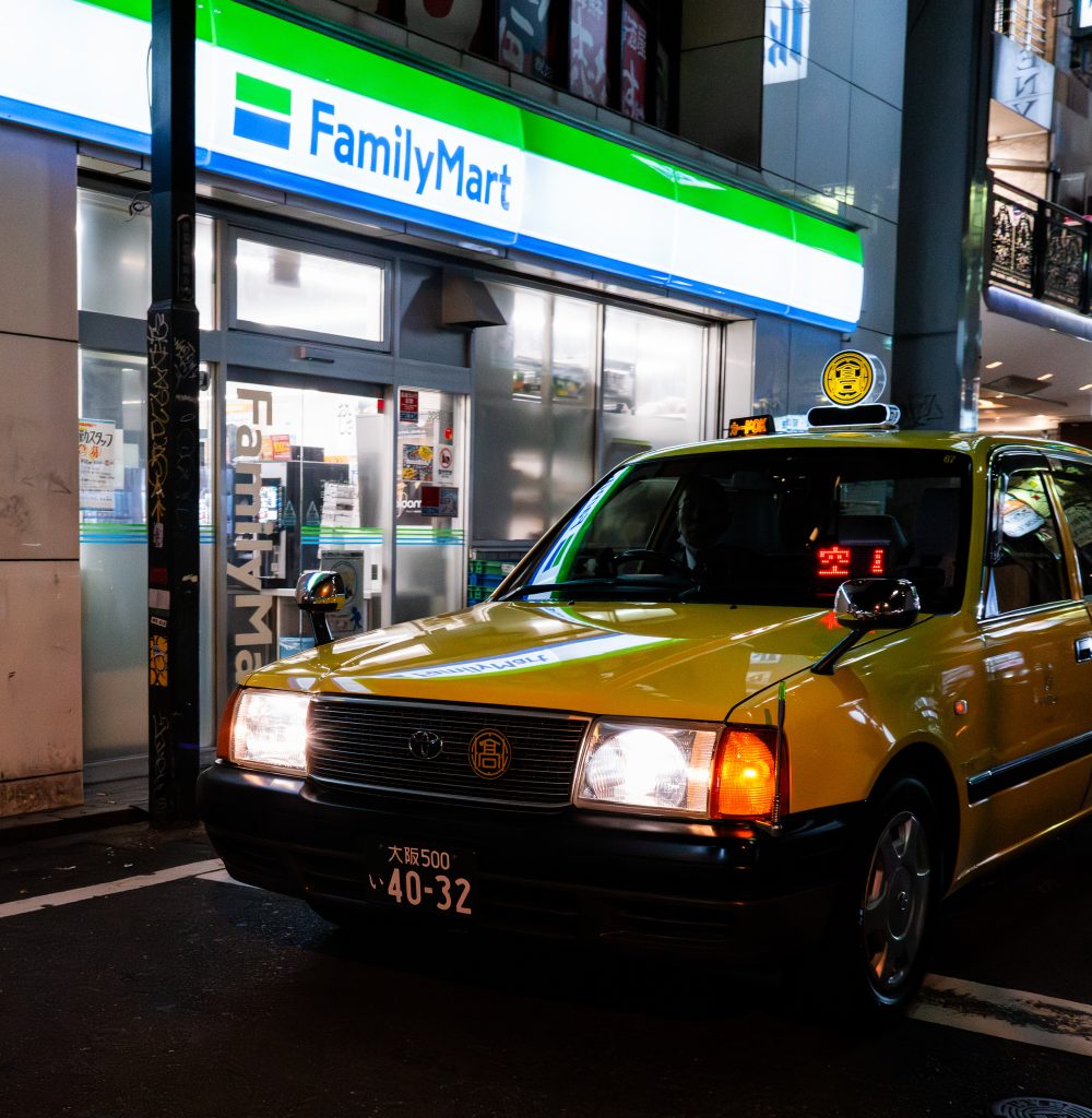 This picture shows a couple of iconic images that appear in Japan and that travellers or locals will be aware of. The Yellow Taxi featuring the red light in the windscreen and the official licensed roof mounted signs. The car waits outside a Family Mart convenience store (konbini) in the city of Osaka after dark. The lights reflecting off the taxi bonnet and windscreen along with other surfaces are what makes this photograph for me, as well as the unmistakable country of origin.