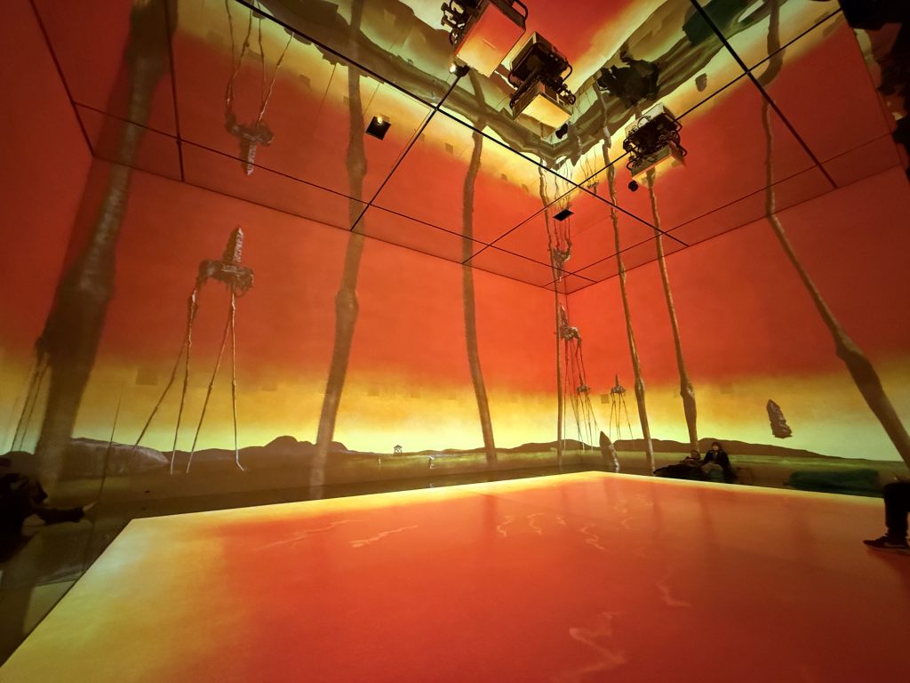 was the first large room I sat in, on a bench near a mirrored stanchion. There were guests all around the edge of the room, some on the floor and some on the provided bean bags. The door had a sign on it stating this show would last 20+ minutes so I sat on the cushioned seat and marvelled at the wraparound experience. It truly was a visually immersive experience with the works of Dali, Klimt, Ernst, and Munch coming to life on the walls and floor, reflected by the mirrored ceiling.