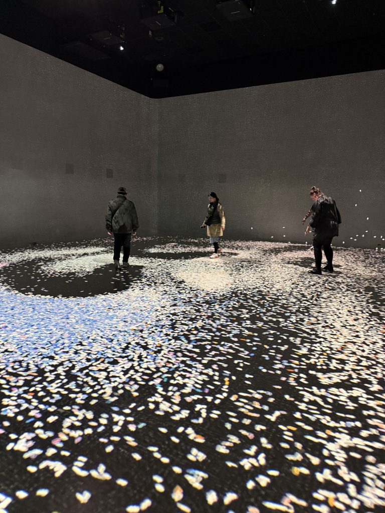 The next room, “Colour in Motion”, featured an interactive component, motion tracking, similar to those in the teamLab:Borderless exhibitions in Tokyo. Leafs and feathers from the paintings as well as blobs of paint would fall to the floor allowing them to trample through and disturbing them as they moved away from the person and in some cases fly up the walls.
