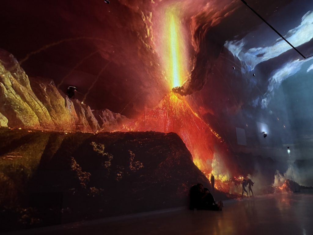 A work that used the medium well was a fresco from Italy being brought to life and the main character walking all around the permitter of the room, before the walls started “cracking” and then a painting of Vesuvius erupting that seemed to project the feeling of heat and the danger of the lava streaming down the side of the volcano.