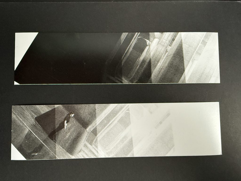 Once I was happy with this I made another copy using the same settings. Once this one had gone into the Fix, I thought back to a trip earlier this month to Tate Britain to the Lee Miller exhibition. In that exhibition were some works by Miller and Man Ray in which they experimented with solarisation, otherwise known as the Sabattier effect. the effects of the experimentation led to some strange results so I figured I’d give it a bit of a go. I hadn’t read anything about how to do Solarisation so tried a couple of things. The first was to flash my phone torch over the paper after a 25 sec exposure, I hadn’t put the paper in the easel correctly but I had ruined the paper anyway. The whole exposed piece of paper was black. Obviously. I then realised that of course it would be over exposed, thats what happens.