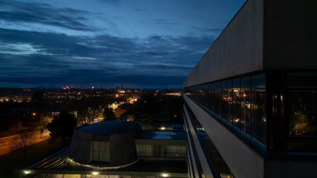 Out with the drone this week in the darkness just with the last vestiges of blue hour hanging on. I took the DJI Mini 4 Pro out and launched it to take some photos of the frontage of the buildings that were formerly the HQ of Shropshire County Council.