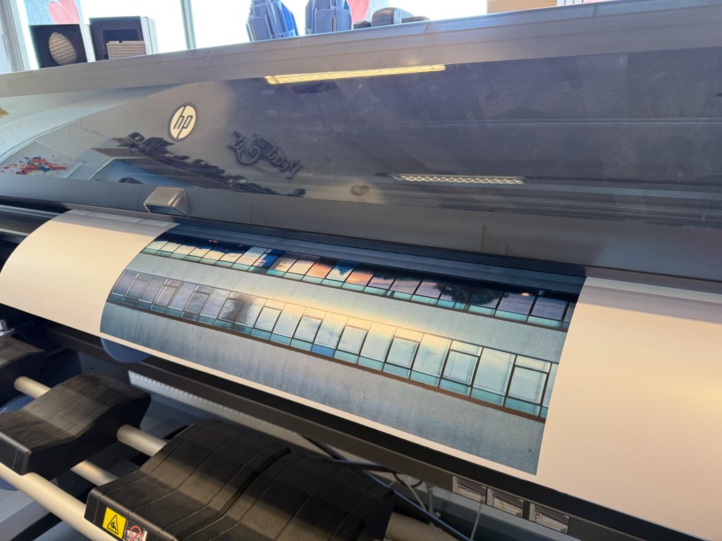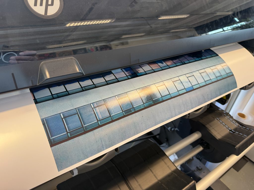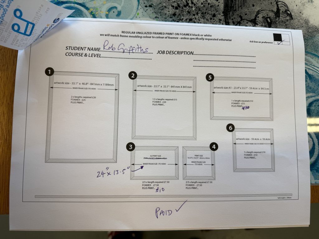 Jim helped me to print out my work and said that he would now have to mount it on the black edged Foamex board. I had chosen a width of the image equivalent to A2 ish, but the image was shot on a 16:9 ratio format from my DJI Mini 4 Pro. The limiting factor was the resolution on this image, it is an 8064×4536 pixel image. At 300 ppi this equates to 26.88″ x 15.12″ size without losing any quality. Jim said that although the file needed to be submitted at 300 ppi, I could have resized it so that the true resolution would be more like 200 ppi and I could still get a usable quality image to put on a wall.
