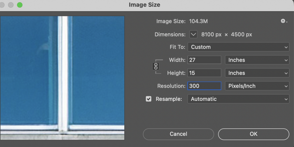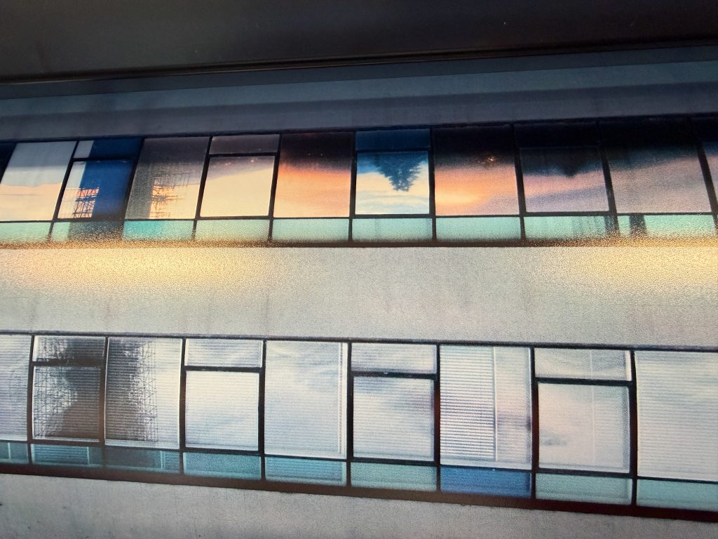 To do this I would have my image at 27×15 inches at 300 ppi, then decrease the resolution to 200 ppi in the image resize dialog box in photoshop. This would then increase the image dimensions to 40×23″ at 200 ppi without a real loss of quality (according to Jim), meaning it would still look good on the wall, maybe not in a book but on an exhibition wall yep. To get the file to be the same size at 300 ppi I would use the resize again but hold the size the same and increase the ppi which then introduces some resampling. Resampling = filling in the gaps between pixels with an average or a more suitable colour. I had chosen to print it on white titanium lustre paper too which really makes the reflective windows look more metallic.