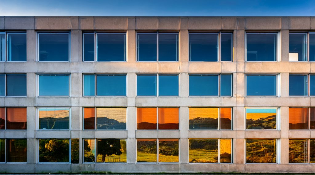 picture of the front of a plain office block made out of concrete with four rows of windows going across the full frame, each of the rows has a mixture of clear windows and some with coloured reflective film in a blue, orange or gold colour. The reflections in the windows should be showing a shropshire landscape distorted by the blackpool fun house mirror style windows and also include a reflection of a doric column surrounded by scaffolding.