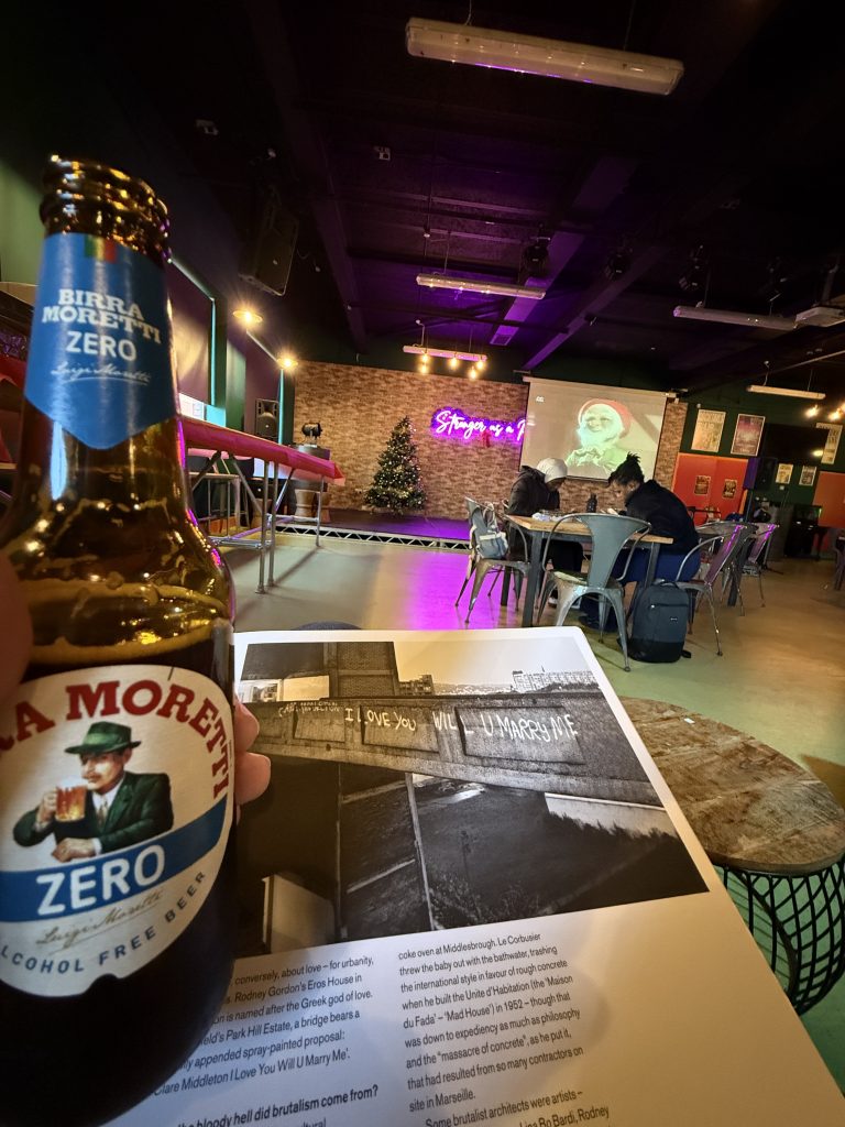 With a bit of time until the 2pm session in the lecture theatre, I headed to the Luna Lounge for a zero alcohol drink and a read of the Concrete Concept book which was interesting in the method that he speaks about Birmingham and its history. It is full of wonderful photos of Brutalist buildings throughout the world.
