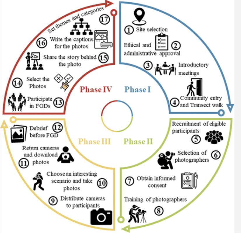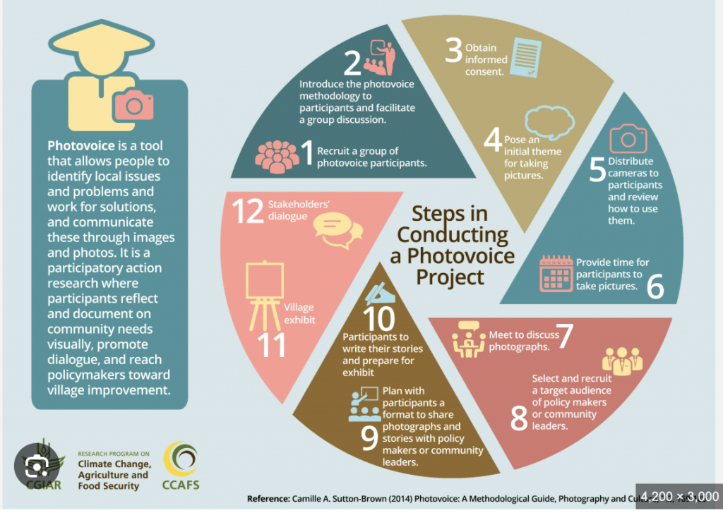 The diagram below shows how a Photovoice project is undertaken and Gavin said that this might be a good method to show the framework. Not copying it exactly but using it as a base for a diagram.