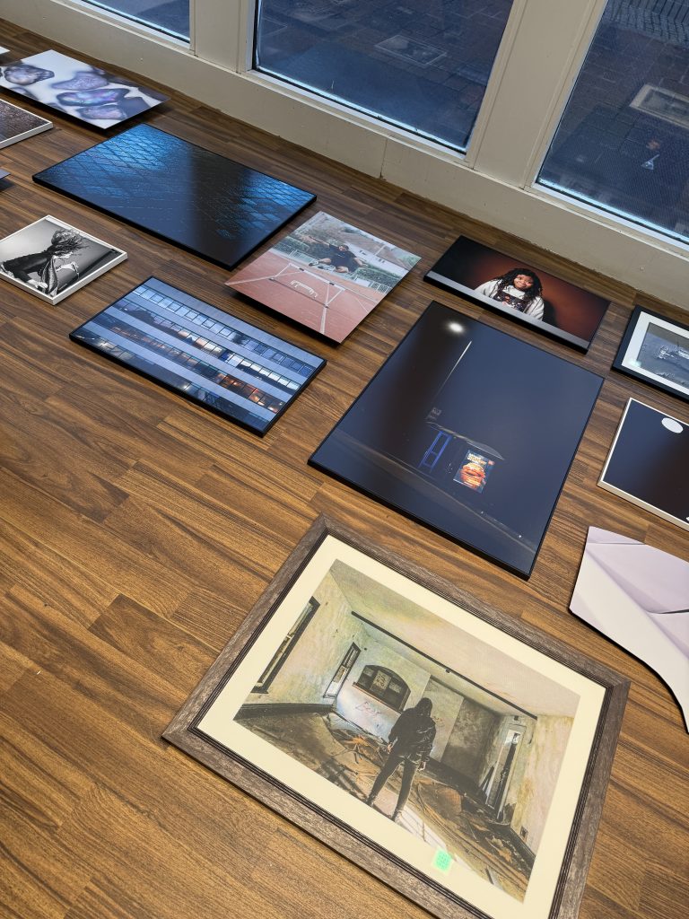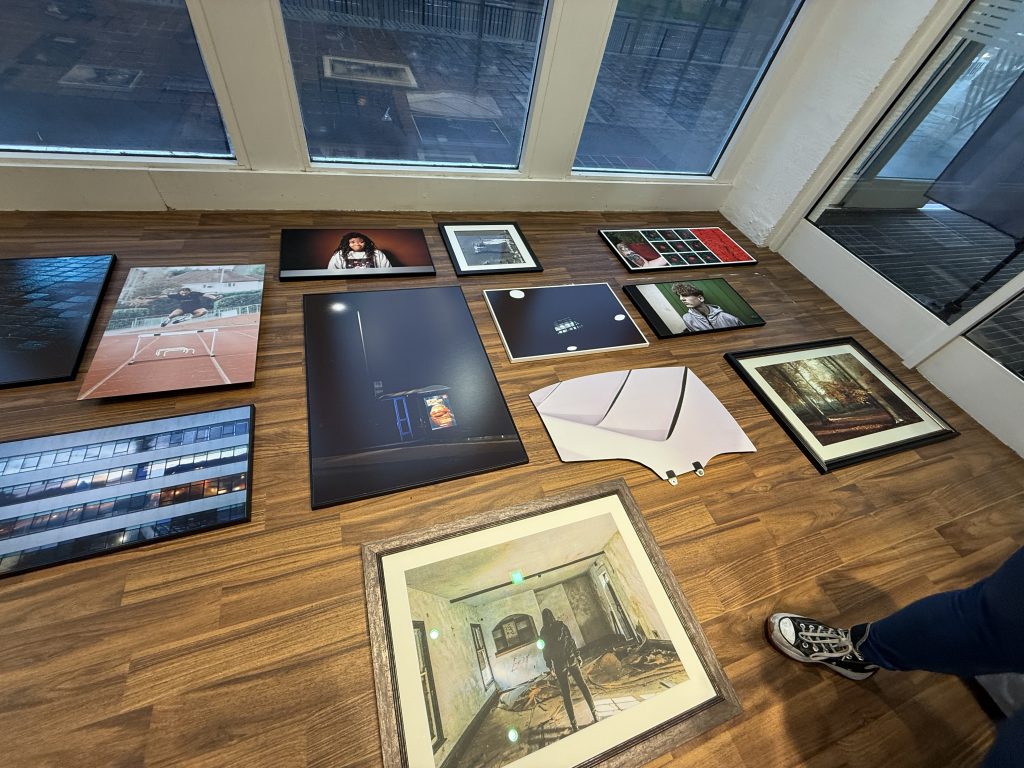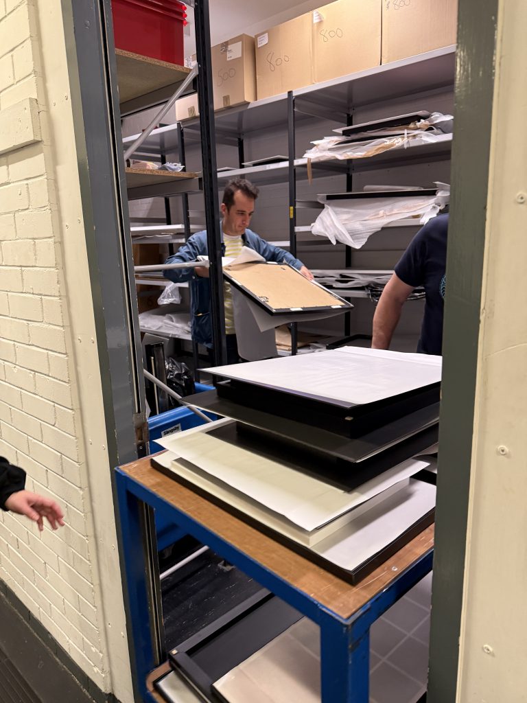 Gathering in the basement with the rest of the team we awaited some news, Gavin and Euripides came and asked us to come up to the ground floor where we were to remove our works from the Exhibition Store Room and then place them on the floor in the area of the foyer so that we could curate the images in a way that suits them all.