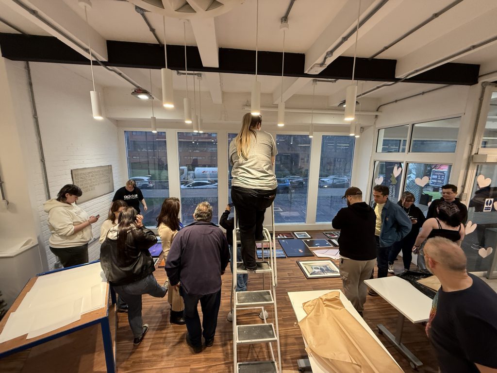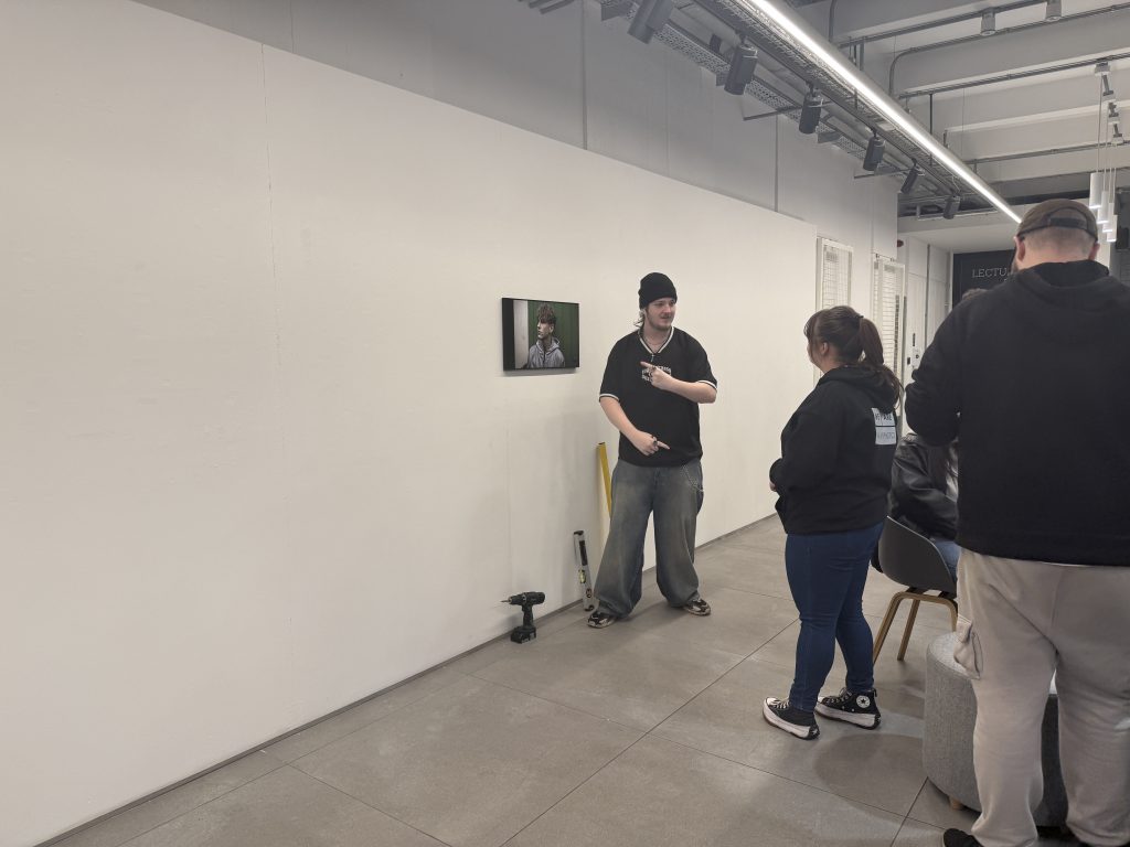 After the hang was finished at around 5pm we all moved back the furniture from the Bessant Gallery into the foyer and tidied up with the final view of the work ready to be opened tomorrow. The poster with the names on was hanging to the left of the exhibition too so that people would know which level it was that had produced the work.
