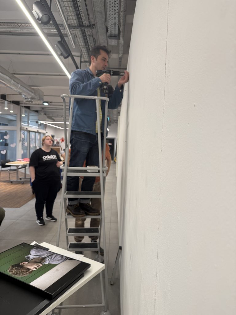 The change to screws was inevitable and the screwing began, one followed by another, then a test hang of the frame. On to the next one using the gaps and sizes previously mentioned. It’s 4:45 now and there are two pictures left to hang. There have been a few of the group who have jumped in and helped out drilling measuring and hanging, but I have tried to stay out of the way a little more than I did in Centrala. I found that I was taking over at that exhibition and wanted to give the others a chance to learn how to handle power tools and tape measures.