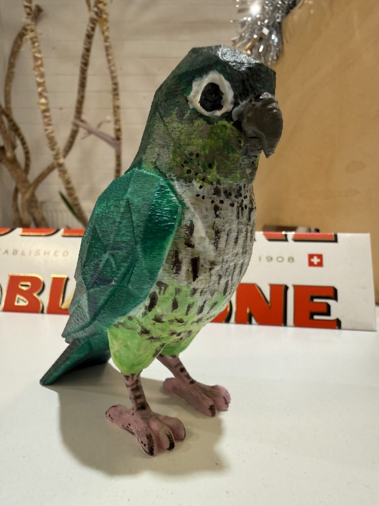 My mission for secret Santa was to buy our tutor Gavin a gift, but I looked around at a few charity shops but didn’t see anything I wanted to gift to him, so I spent a fiver on a Toblerone and then also made a 3D Printed Parakeet. I then painted the model to appear similar to his own parakeet, with the use of Instagram images of his bird. Gavin seemed to like it and he took it home, I didn’t own up that I had been his secret Santa supplier though as I was unsure as to whether he still had his bird at home and didn’t want to upset him if the bord had recently died or something. That is my usual luck, I’m quite adept at buying a dog collar for someone who has just had their dog put to sleep or similar.