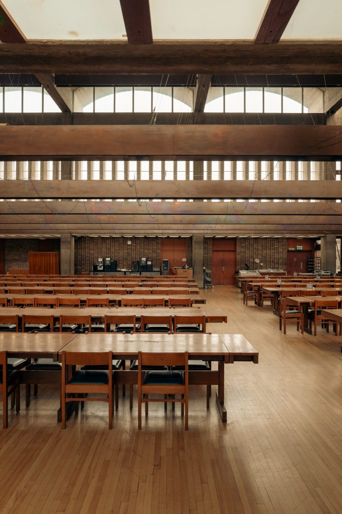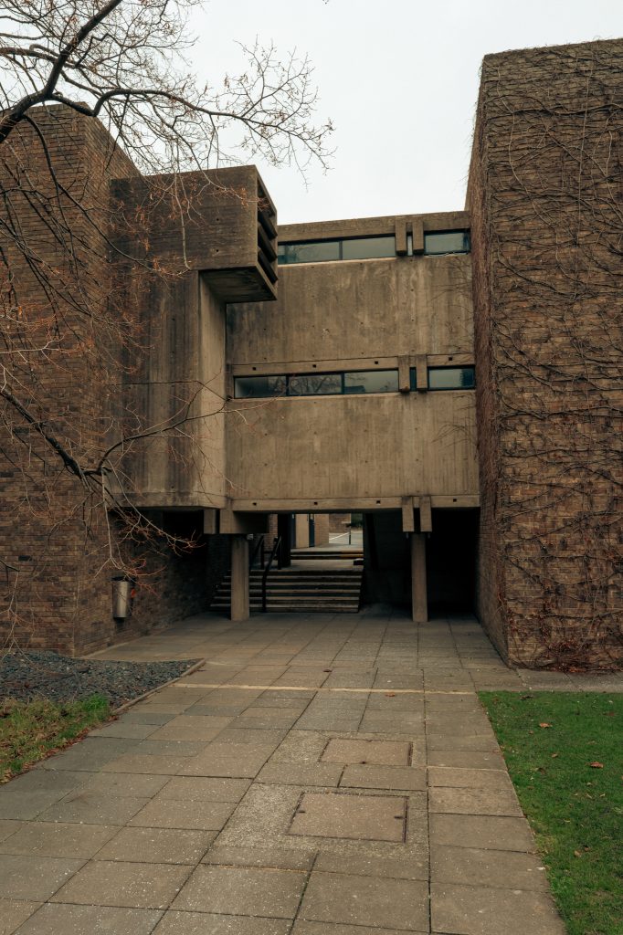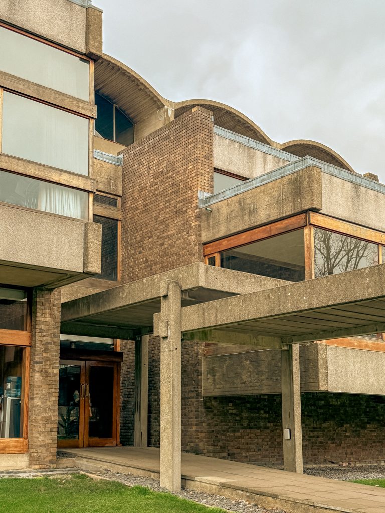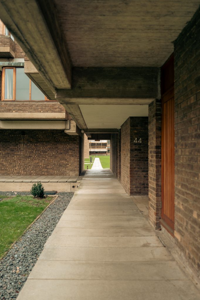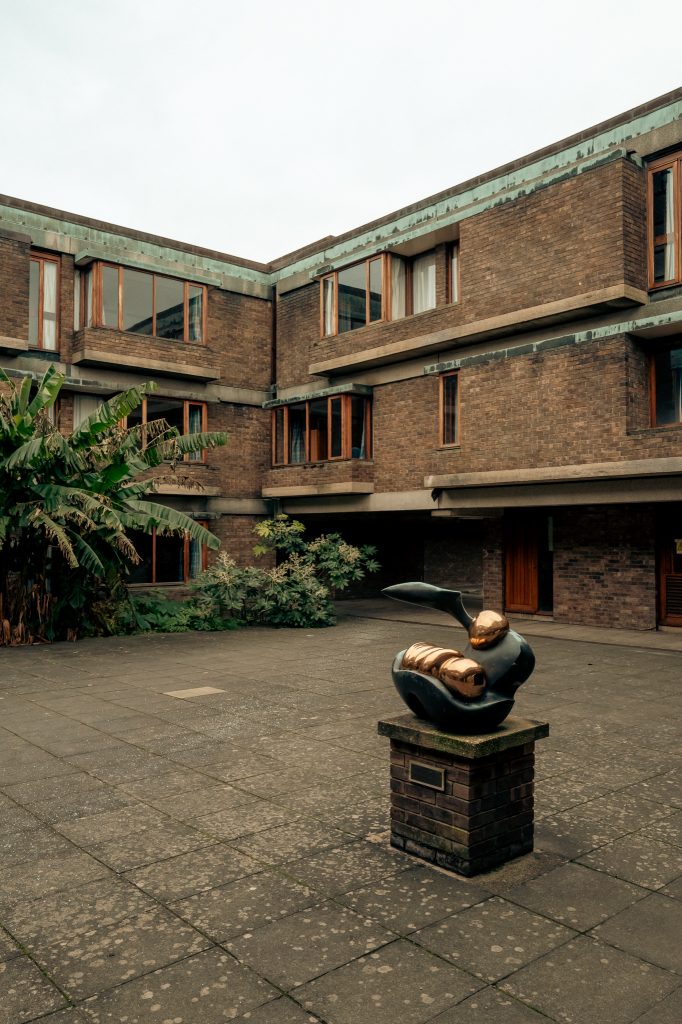 From the porter’s area I walked out into the main accomodation area which comprise of concrete walkways and enclosed courtyards with grass, concrete paving or even sculpture in the centre. The uniformity of the areas struck me first and the community style nature of the place with almost all living spaces looking over the central courtyard. Moving through a tunnel into the next quadrangle left me faced with a practically identical setup. The walkways appeared to be many concrete blocks, almost as if they were upturned concrete railway sleepers, some had holes in also. The mixture of materials is also what stood out to me, as it was not concrete entirely it was made up of dark brown engineering bricks, concrete and wood in many different forms. Some of the concrete was also displaying the signs of the shuttering boards that give the concrete faces a wood-grain appearance.