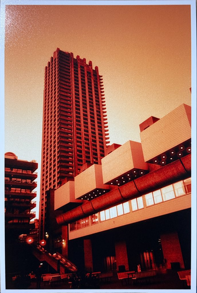 I was visiting Barbican again, to visit Carthusian Street and the home of the Slow Horses, Slough House which is above an Italian Restaurant close to the exit of Barbican Station. Its featured in five series of the TV Spy drama featuring Gary Oldman and Jack Lowden and I wanted to go and take a look as well as have an amble through the Barbican Estate with my Redscale film in my 35mm camera. I took my tripod and shutter release cable as the redscale film is ISO 125 and it was going to be dark soon, so I wanted to get some good photos, and Ive learnt to overexpose the two different redscale films I have tried. Harman Red this time and Lomography Redscale previously at Dudley Zoo.