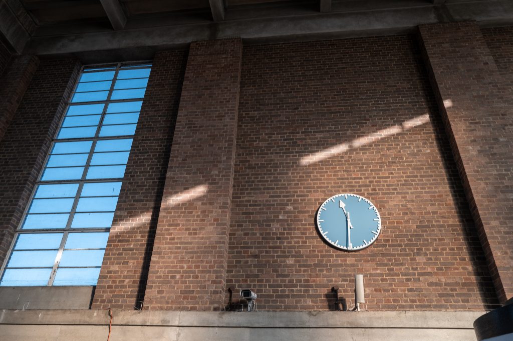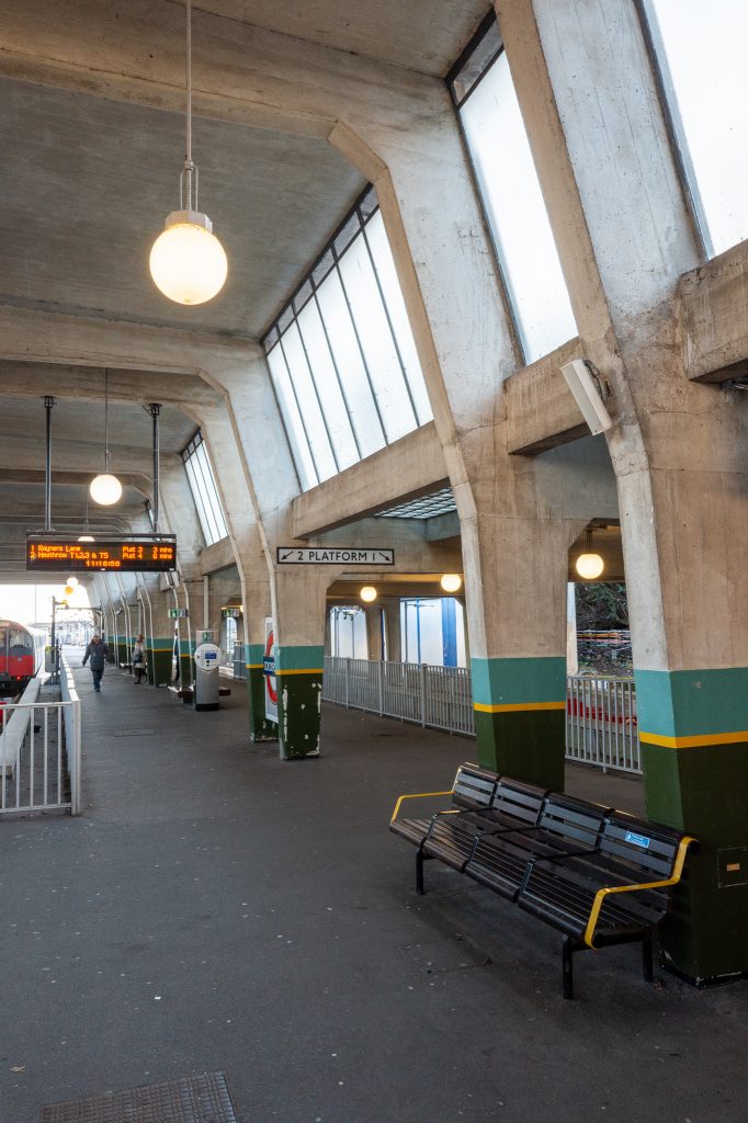 After arriving at Cockfosters I had a look around the station and it was only when I got to the platform did I see what Owen Hatherley was referring to in his book Modern Buildings in Britain, which I had received as a gift for Christmas. The concrete structures over the platforms designed to allow tall trains in Platform 2 and the tube carriages just barely slipped beneath the beams of platform 1. The concrete was smooth and raw looking, but painted at the foot of each of them with two shades of green and a yellow stripe. This was fitting when compared to the remainder of the station. Huge sloping frosted glass windows were all around to let the light into the ticket hall and the platforms but the lower height in platform 1 made it seem a little claustrophobic and dark. There were some panels in the roof of glass cubic blocks making up skylights and the design of the signs and text around the station felt classic and old school, whilst the concrete felt relatively recent, an odd contrast. Looking at the view from further down the platforms this structure would not look out of place in an episode of Andor or Mandalorian. Click on any picture on this page to get a better view of it.