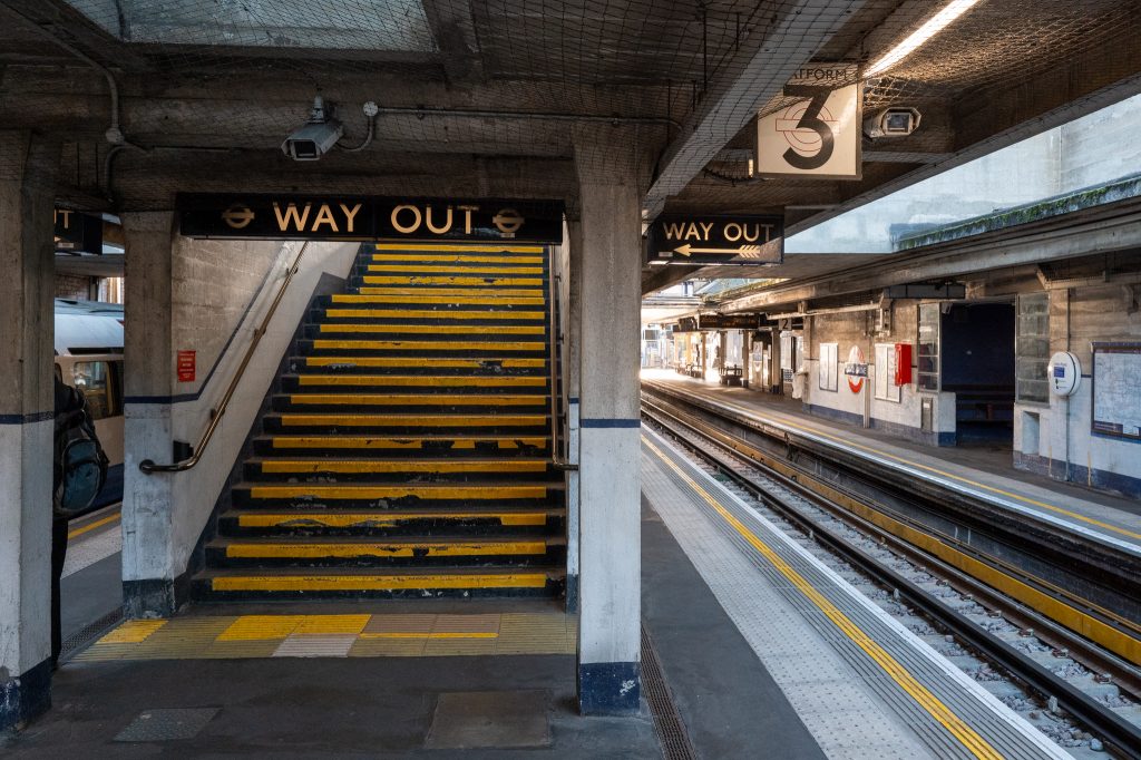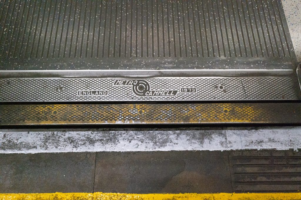 Light green paint (or is it a blue?) was accented around the whole station, around the bill posters and on the walls. Whilst on the platform I was fortunate to capture the shadow of a pigeon on a wall, after about five minutes of patiently waiting. At the same time, a man came down the stairs, barking and making some rare noises that could have been tourette’s syndrome or something else. I kept me eyes on him in case there was any issues and then he got into the lift and went back up to the ticket hall level. When boarding the train for the next destination I noticed that the plate in the doorway gave the manufacturer as Metro Cammell and a date of 1973, the same year I was born. It’s impressive to see these rolling stock still doing their job after 52 years, I’m barely able to do mine any more!! 😉