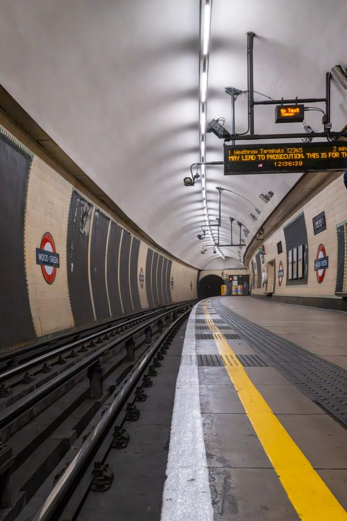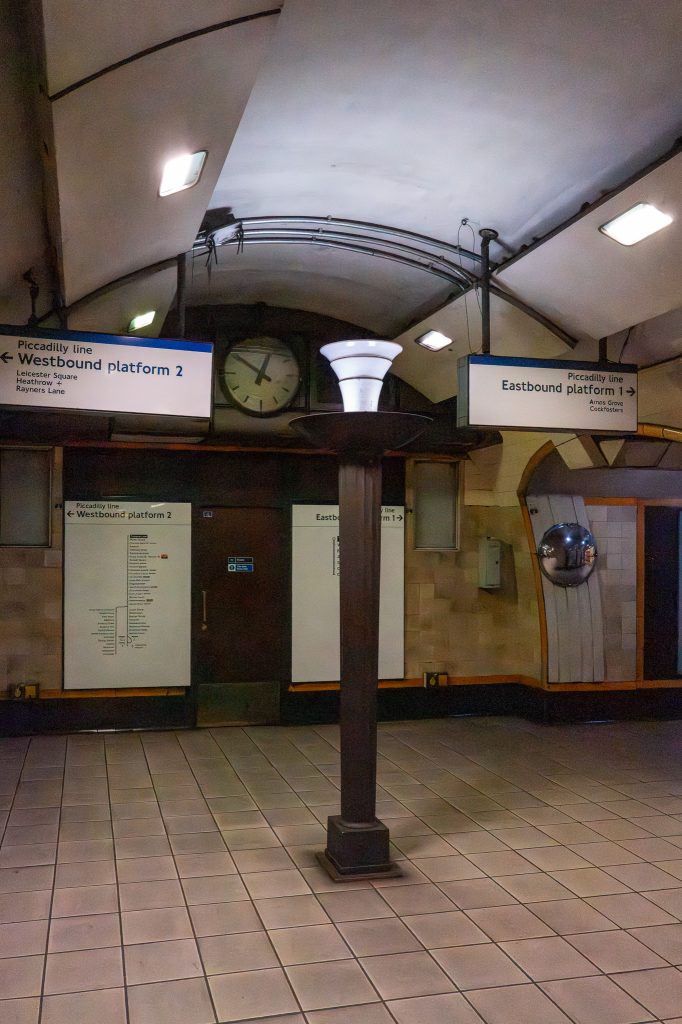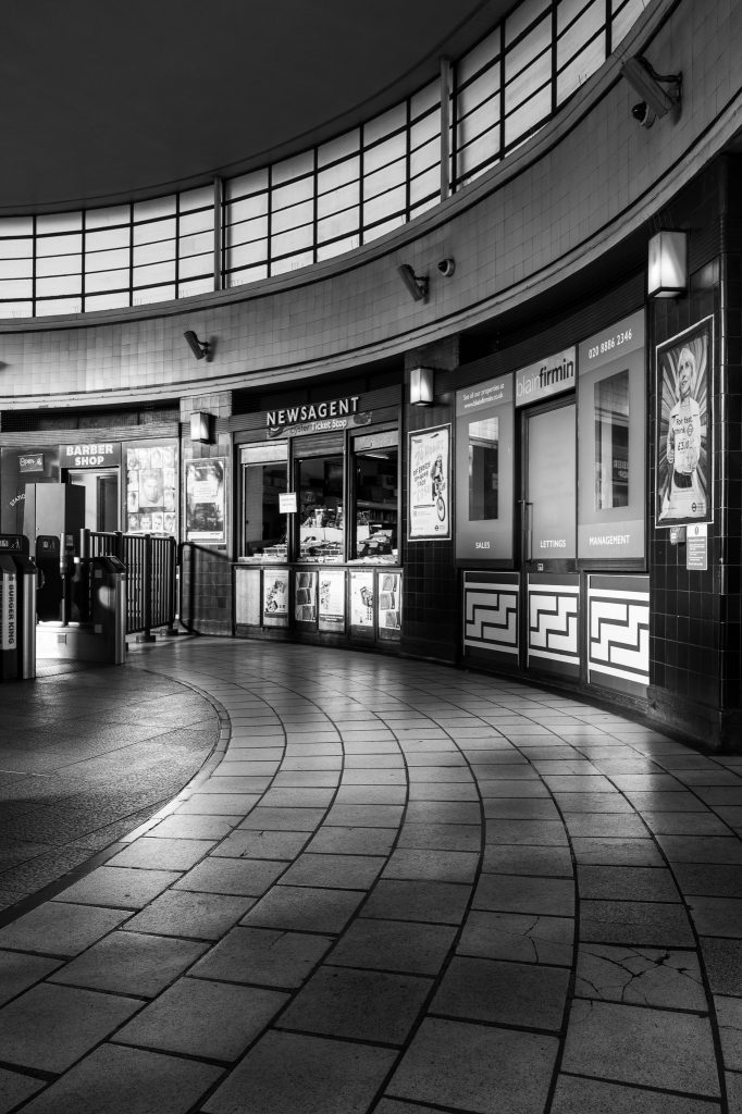 Next stop up the line was Southgate, a lower height ticket hall in a complete circular form looking like a 1950s American diner dressed with a couple of shops and station graphics. This station was opened in 1933 and whilst the outside offered some nostalgic views of the Station Parade shops that looked over the station. These shops including the clock that was recently refurbished were also built and designed at the same time as the station by the same architects. Inside this station, on the escalators to the platforms were some bronze uplighters that rise from the escalators and shine light onto the curved roof above.