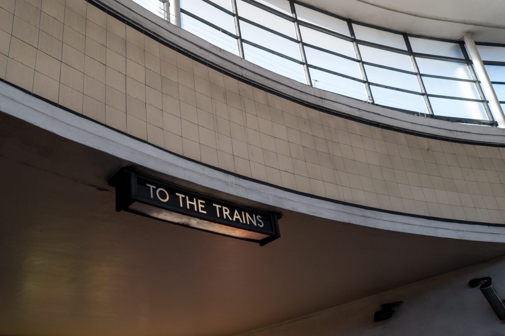 Arnos Grove was the next place I alighted, jumping off the train and letting it leave the station I was pleased with the light on the platforms opposite with another train sat there. The low concrete ceiling over the top of the platform. Moving up into the main station building saw a set of concrete stairs with the classic signage adorning walls and over stairs. Up into the hall there were some wonderful information boards “London Underground History” before getting into the main circular hall. The walls here are a mixture of Oakwoods tall rectangular hall and Southgate’s short and round building. It was tall with wonderful lighting coming in through the windows. The centre of the hall is seemingly supported by a singular column with a cone shape connection to the roof. At the foot of the tower is the passimeter, which looks like a small greenhouse with the signage in place above the windows. It would have been an information point before the TFL reduced the headcounts in the stations by fitting electronic boards in the windows. Time to head back down to the platforms and head on to the next station.