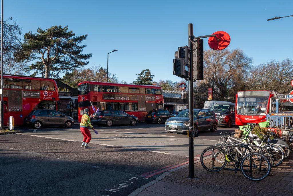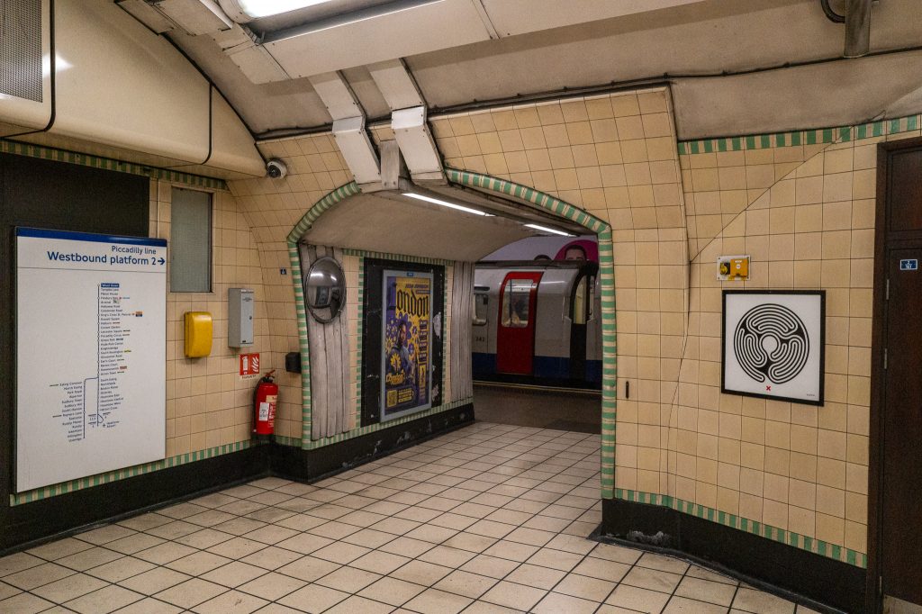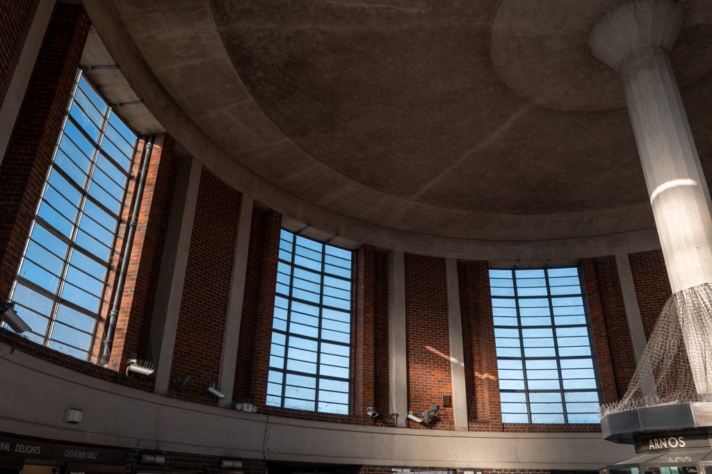 Next stop on the way into the city was Manor House and the station featured blue accents all around and the ceiling in the ticket hall was covered in a concentric circular pattern with the round lights in the centres. In the centre of this hall was an information board featuring history of the station, but it would have originally had train timetables etc on display. This set above a rubbish bin which also went all of the way around the column, in the history info it states that these rubbish bins were one of the earliest examples of multi purpose integrated features in the underground stations. I popped out onto the street for a scout around and the first thing I saw was a man juggling with clubs at the front of a stopped queue of traffic. Bus and car drivers must have sat there watching him with amazement and I didn’t see him go around with a cap for donations or anything so I wonder how he makes money from this. Probably on TikTok or something similar. Back into the depths of the station again after a quick look around and off to my final destination on this part of the journey. A change at Kings Cross St Pancras and then two stops on Circle line to Barbican.