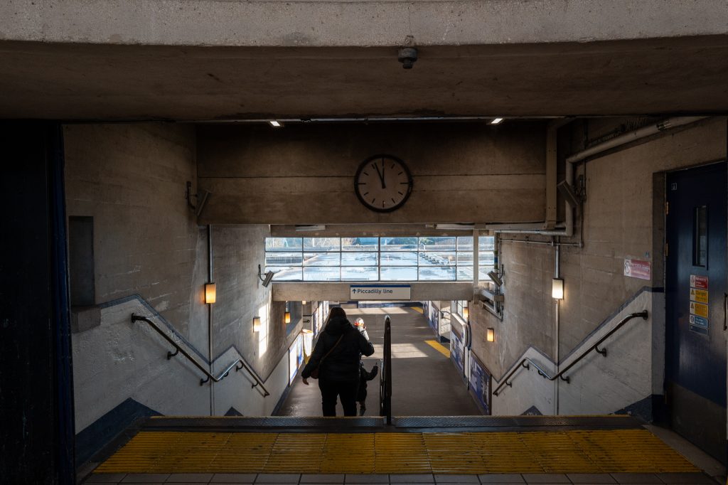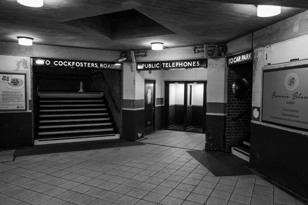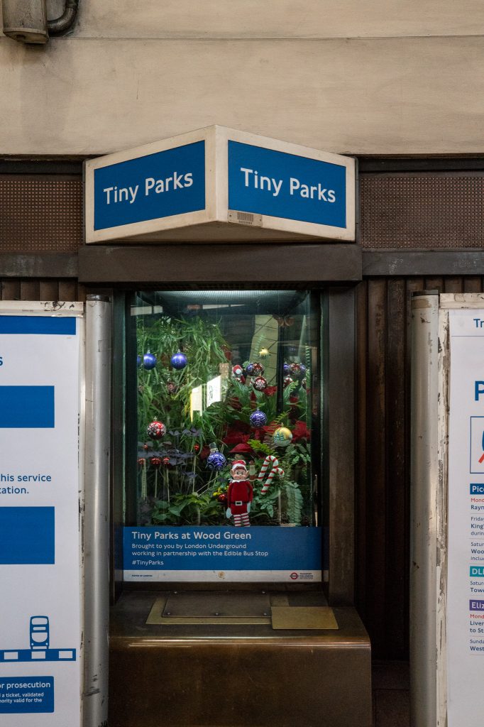 Wood Green was the next exploration, and after coming off the platform I can see the similarity in the apertures from the platform into the exit hall, with the previous stations. No uplights on the escalators here though, just the usual fluorescent tubes on the ceiling of the electrical stairway. The exit of the station leads me out onto the street where a person was feeding a huge amount of pigeons. Behind me was the large circular building of the station with a tall rectangular tower that probably contained the ventilation. Heading back into the station I noticed that the ticket windows were not manned but the signs above them showed that they were now “Tiny Parks”, a small terrarium inside the glass and as it was the Christmas period there was also an elf in there who was being missed from his shelf no doubt. Moving towards the escalators down to the platforms I liked the look of the tops of the three electrical staircases with the original clock and “To Trains” sign so thought I’d stay there and grab a photograph, only the people in the station thought I shouldn’t get a photo. They kept coming through the gates and then as soon as they’d disappeared over the brow of the escalator another person’s head would pop up and get in the way. About ten minutes waiting yielded a couple of photos before the area filed with families once more so I then headed down to board the train.
